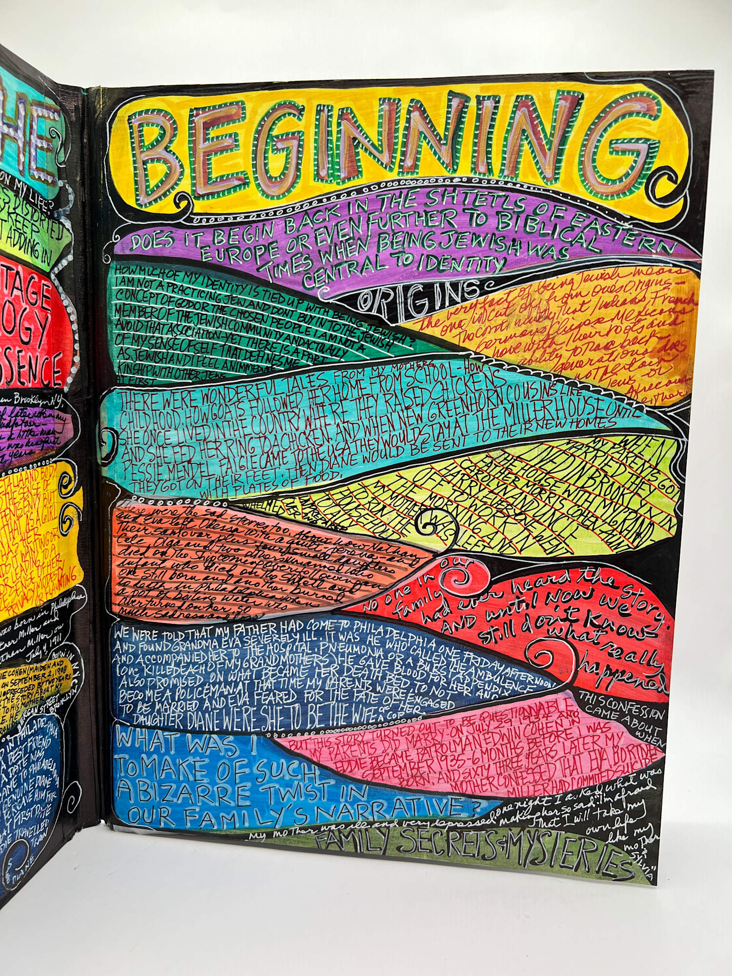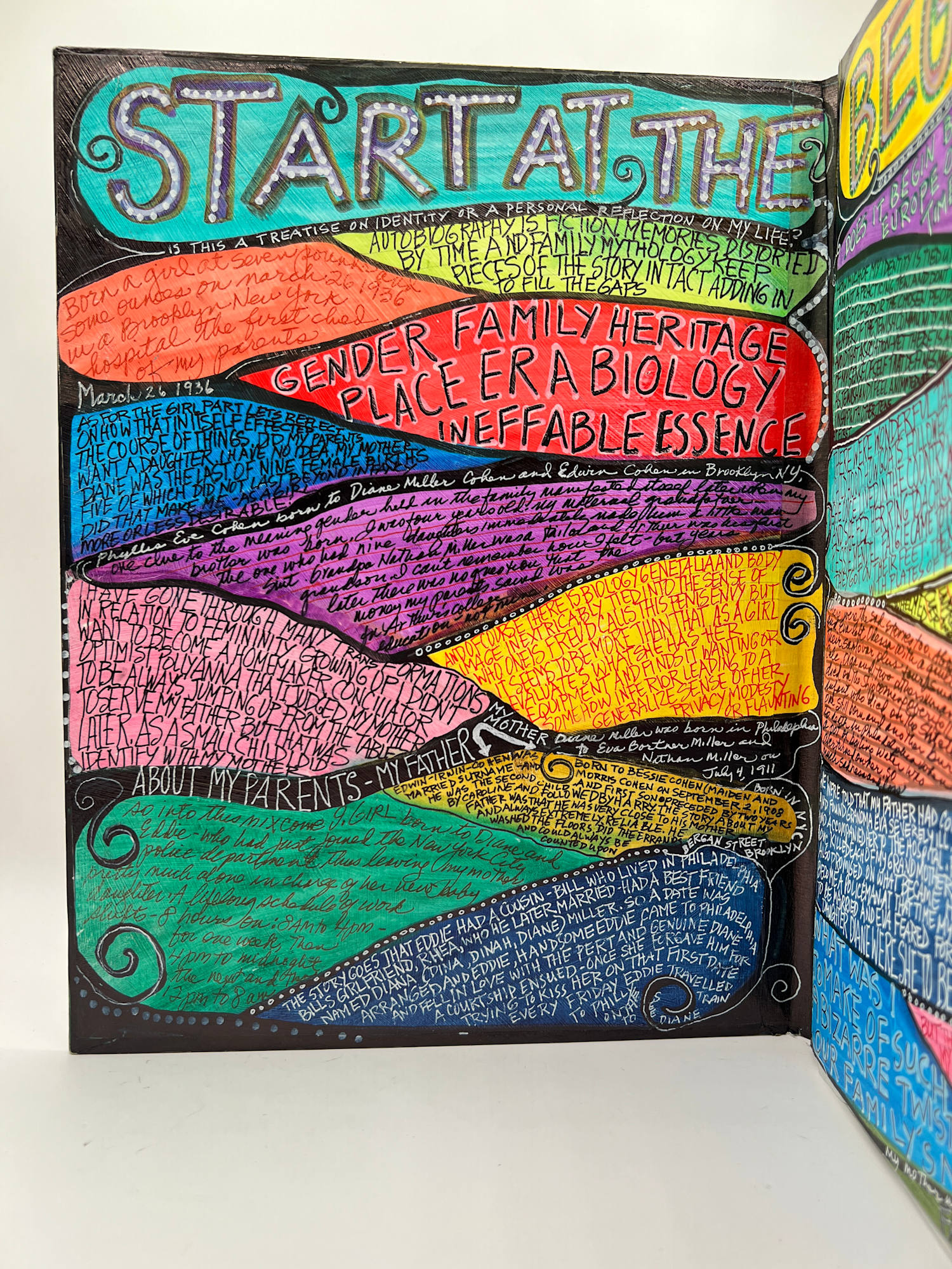Hardbound altered book with 14 pages, including front and back cover, autobiographic multi-font text