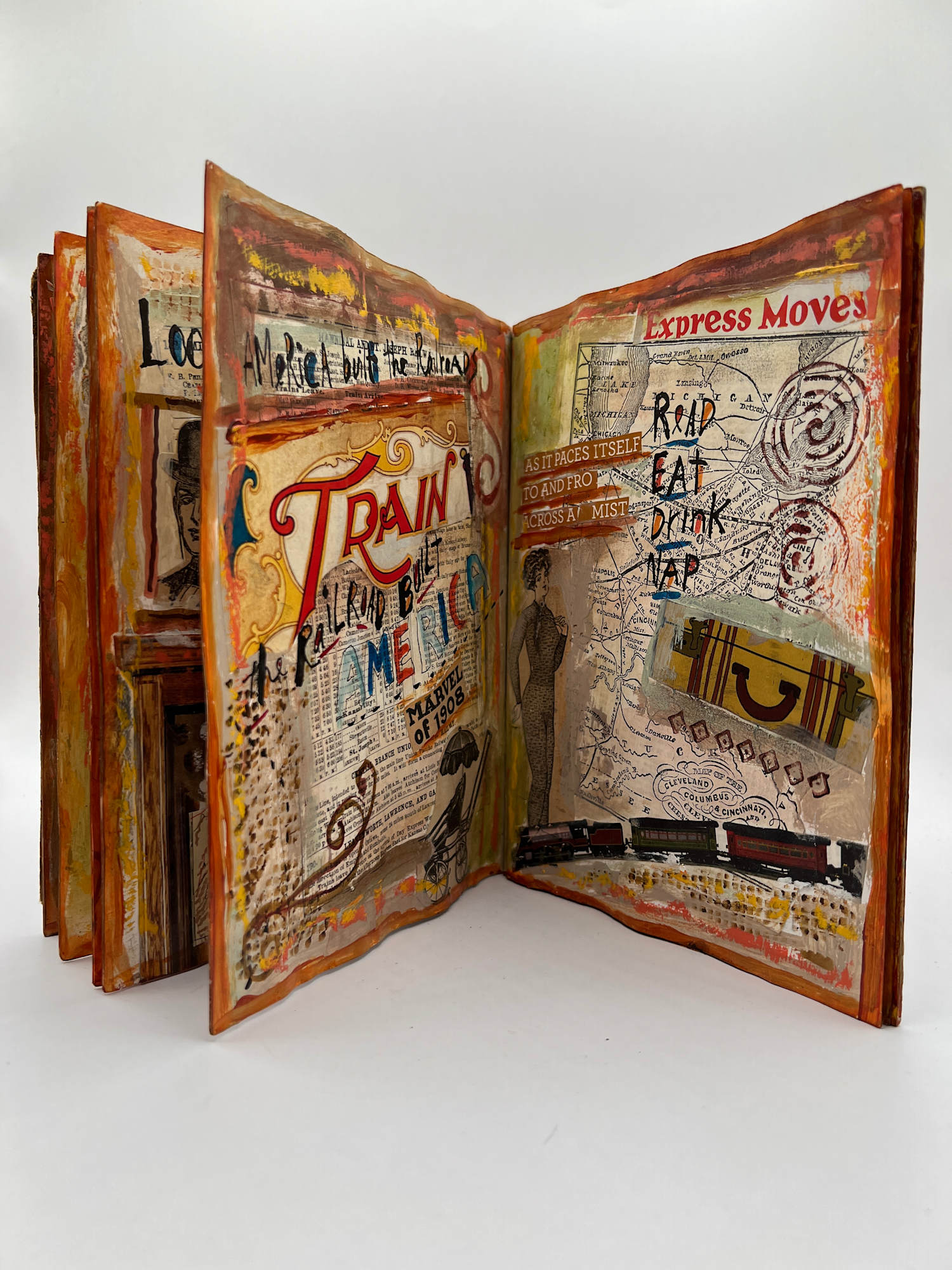 - Subject Matter: 12 page mixed media altered book of images, collage and original text captures the experience of traveling by train