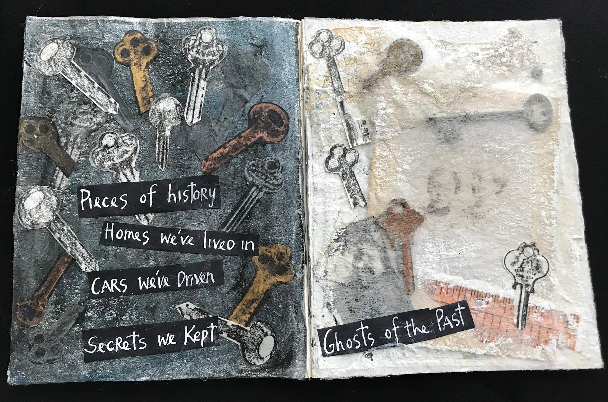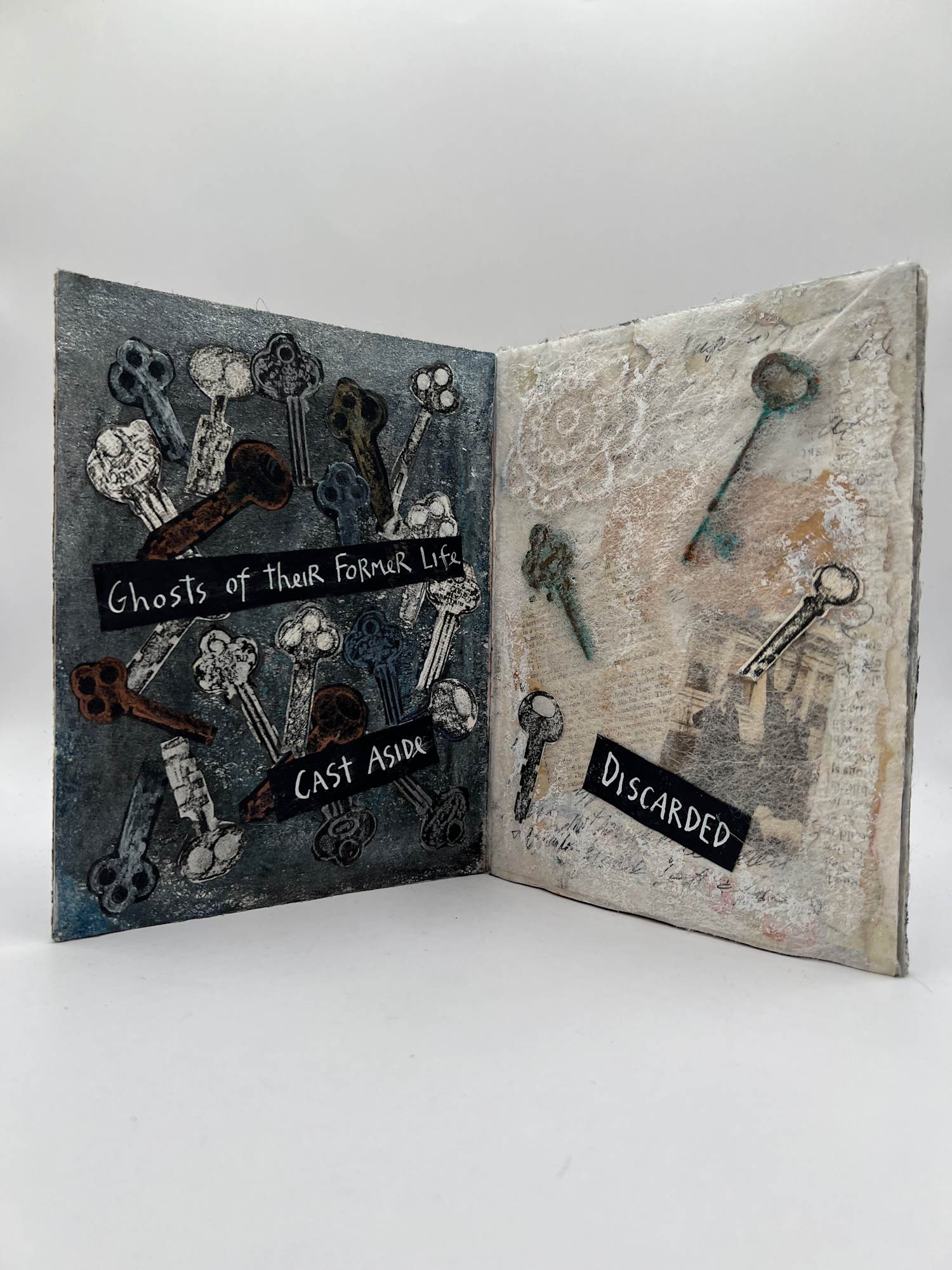 8 page Golden book, collage of rubbings and actual old keys layered with dryer sheets and original text