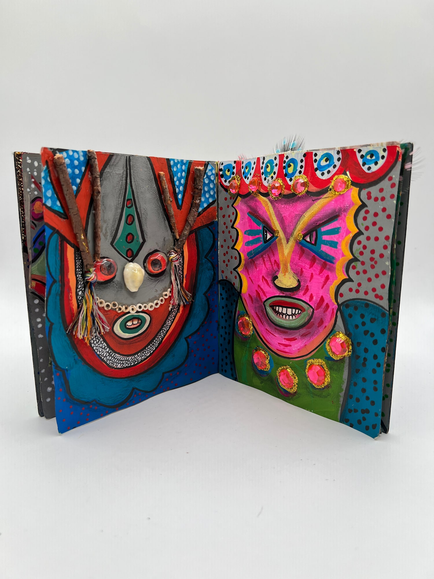 11 Sculptural 3-d Masks painted and assembled from a wide variety of surprising components in a book format.