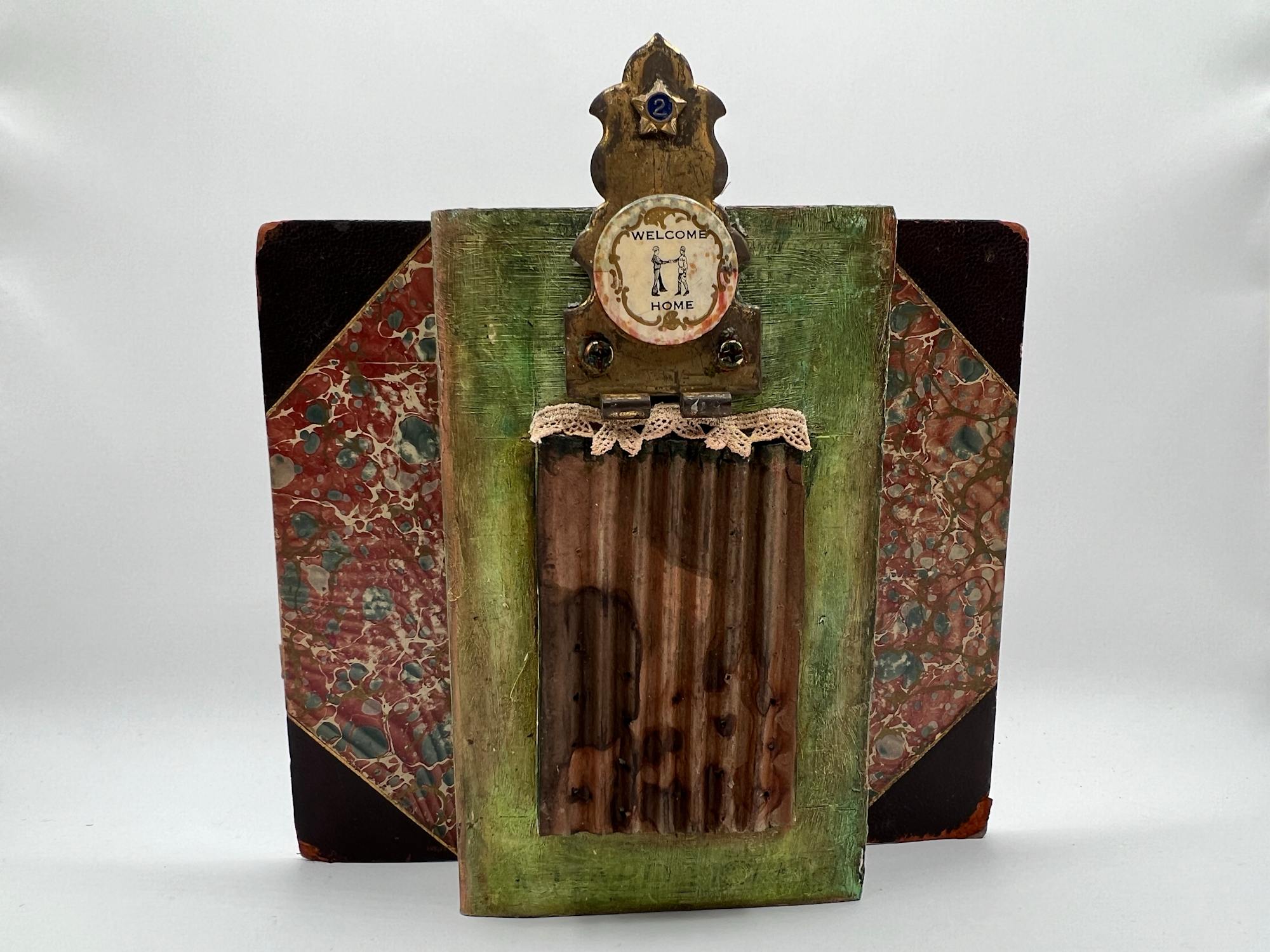 Combined sealed painted and carved paperback book, vintage book covers and found objects