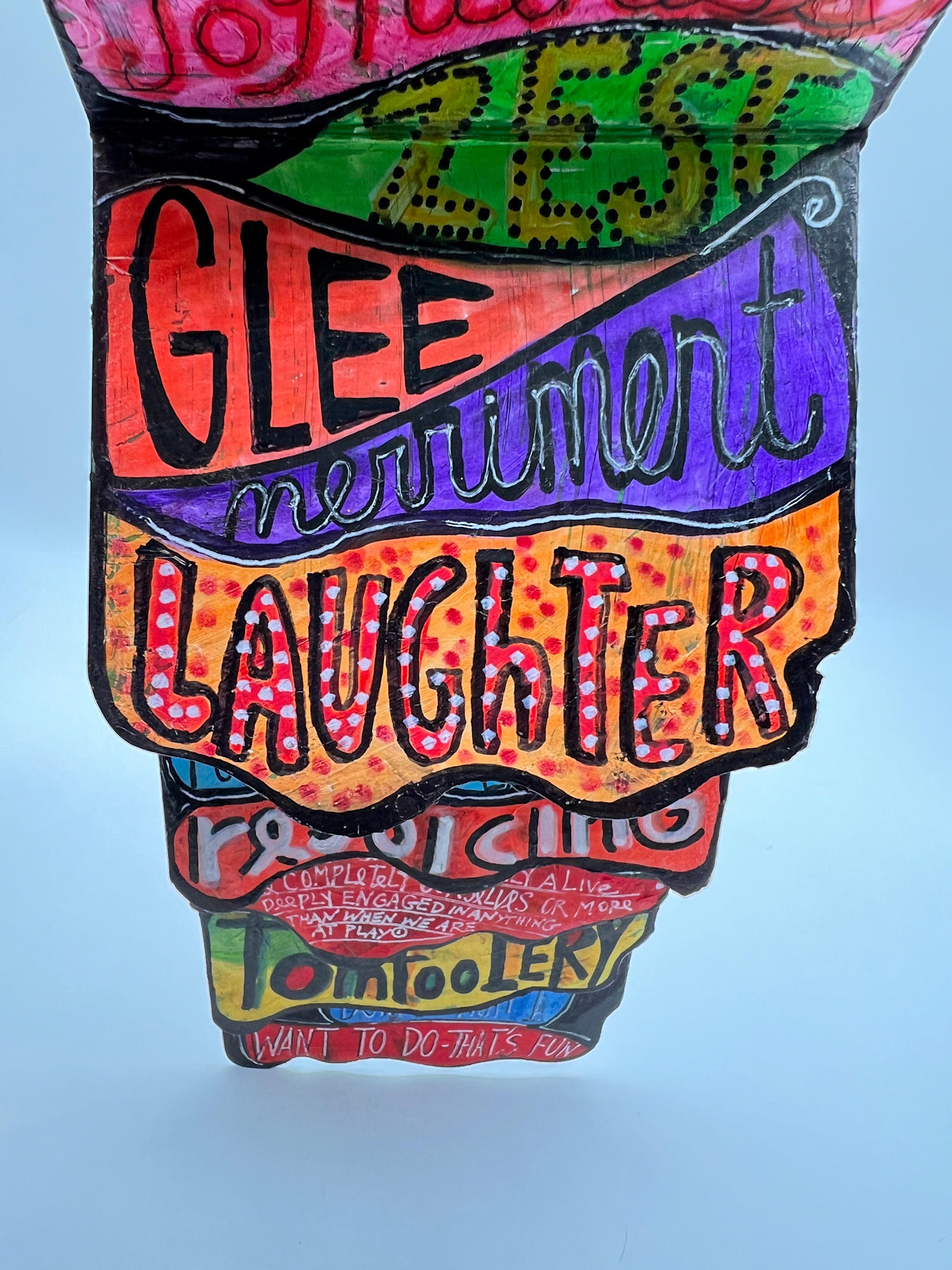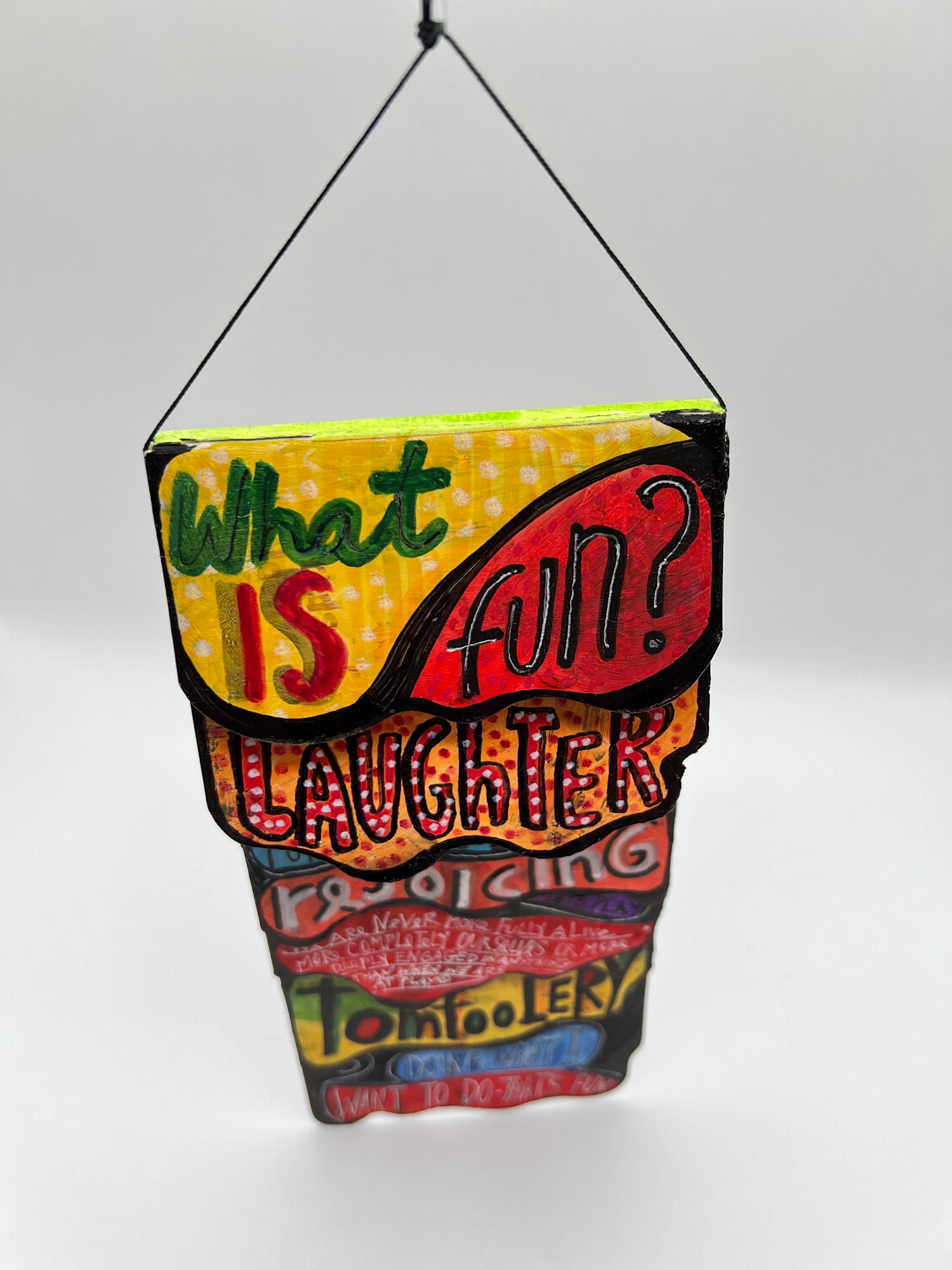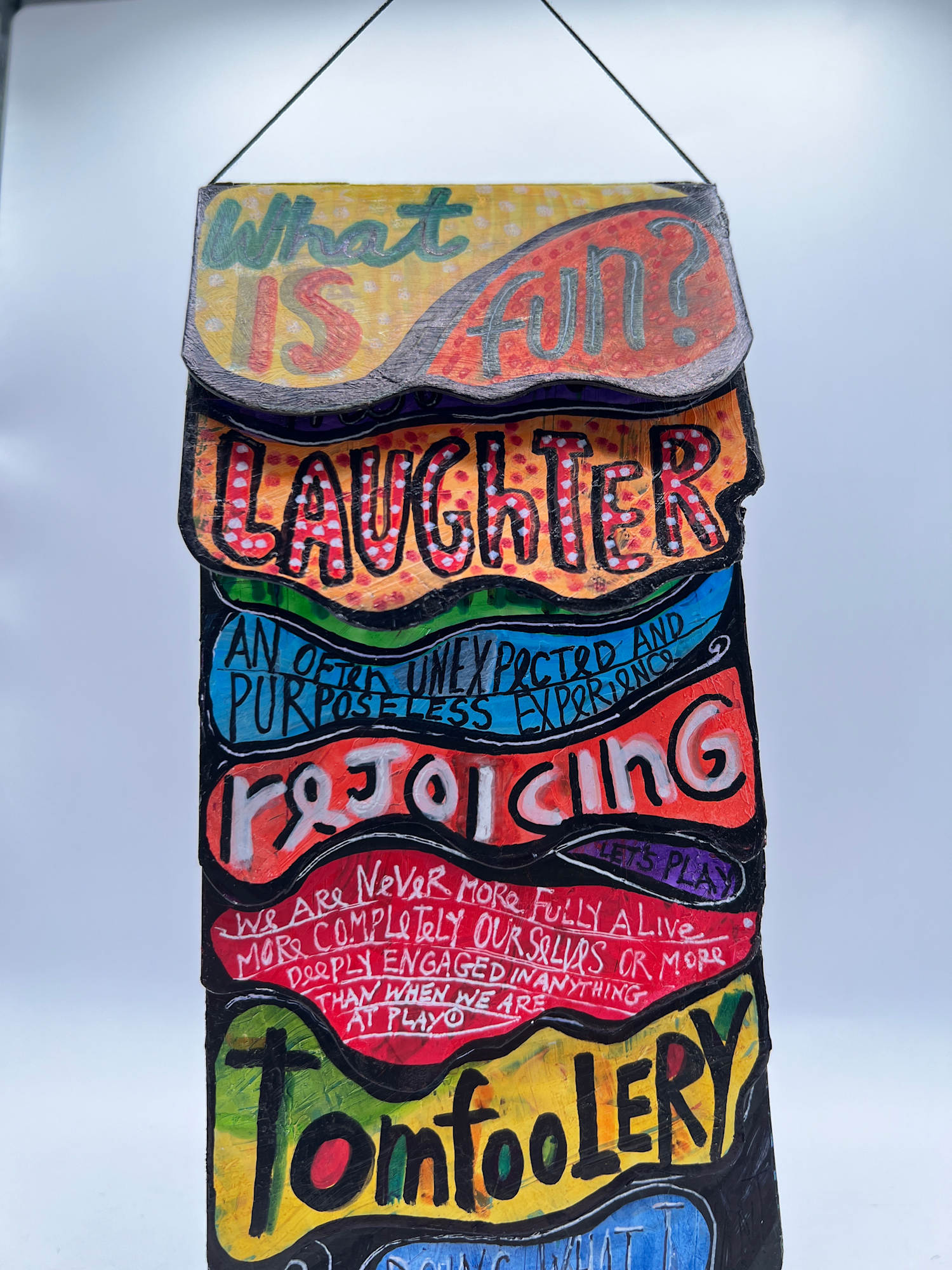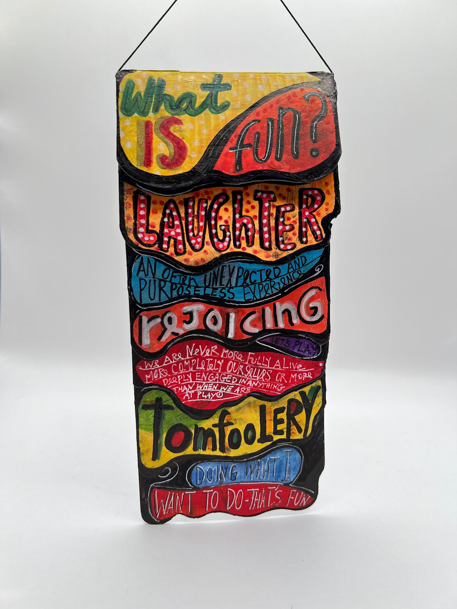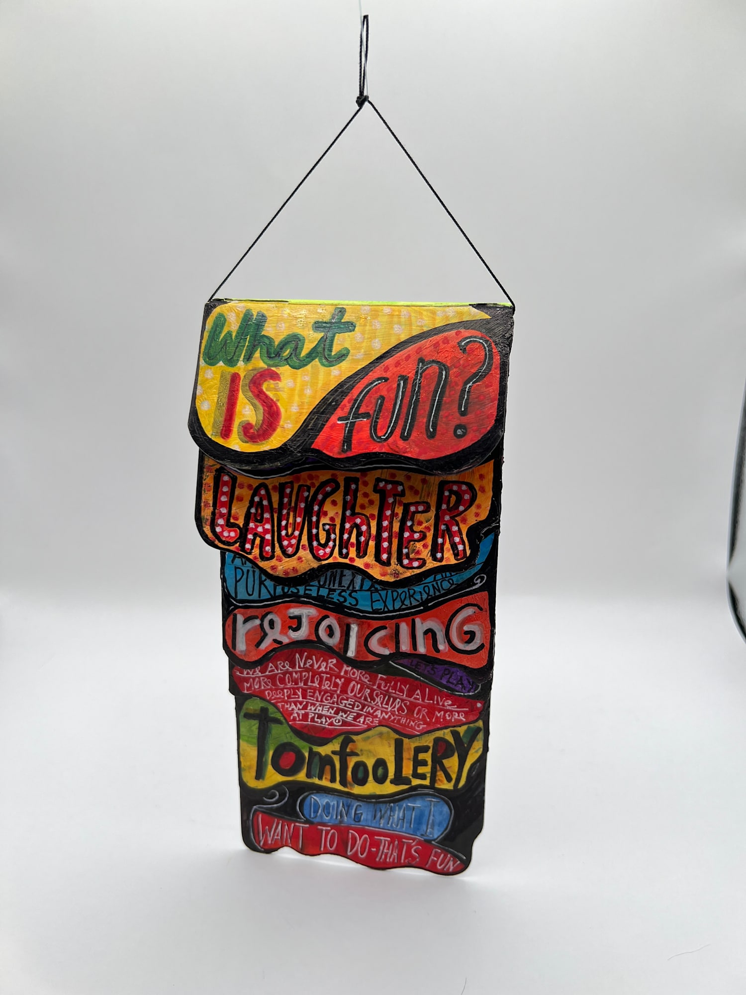 Children's flip book with 6 double sided pages and multiple colorful fonts about fun, joy and happiness. Can be hung.
