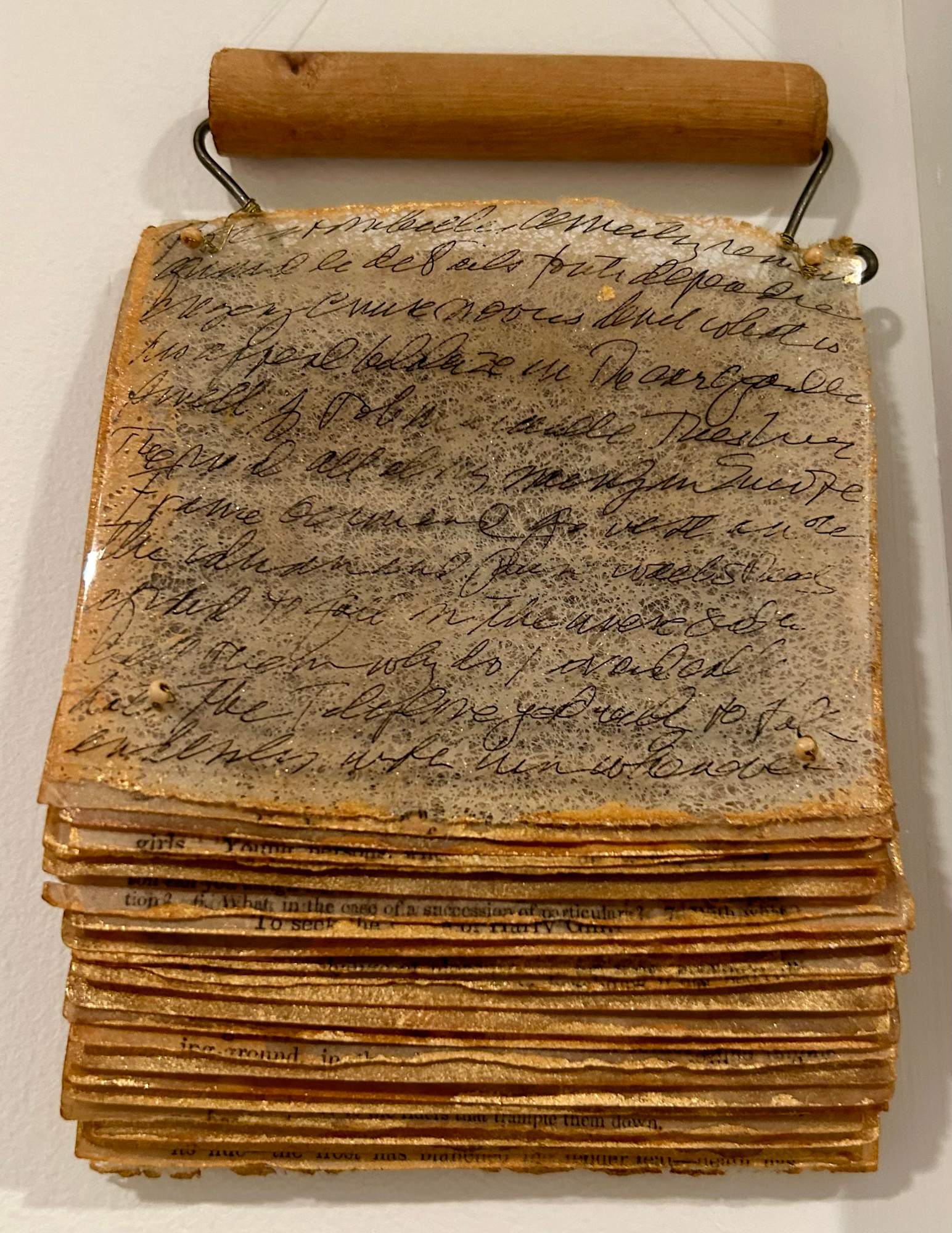 An unreadable book. The pages are waxed dryer sheets which have been layered and sewn together. An overlay of acetate has undecipherable writing.