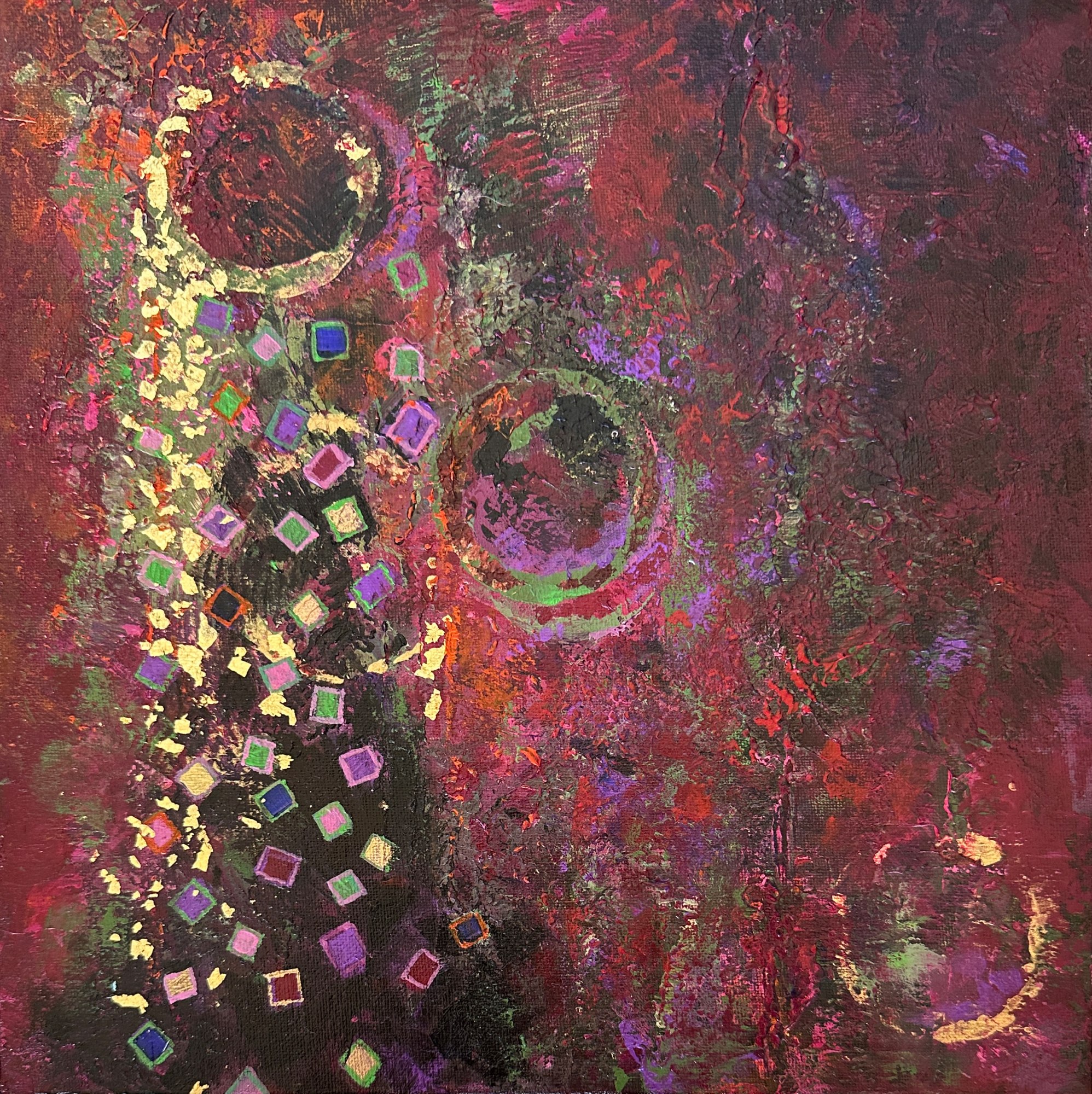 Breaking Free is a striking abstract painting that exudes a sense of liberation and movement. The rich, textured layers of vibrant color, including shades of purple, red, and hints of green, create a dynamic and energetic composition. The bold ring-like forms and diamond shapes add depth and visual interest, drawing the viewer in for a closer look. The use of gold leaf in the process adds a touch of luxury and sophistication to this captivating artwork. Overall, Breaking Free is a powerful and expressive piece that invites contemplation and reflection on the concept of freedom.
