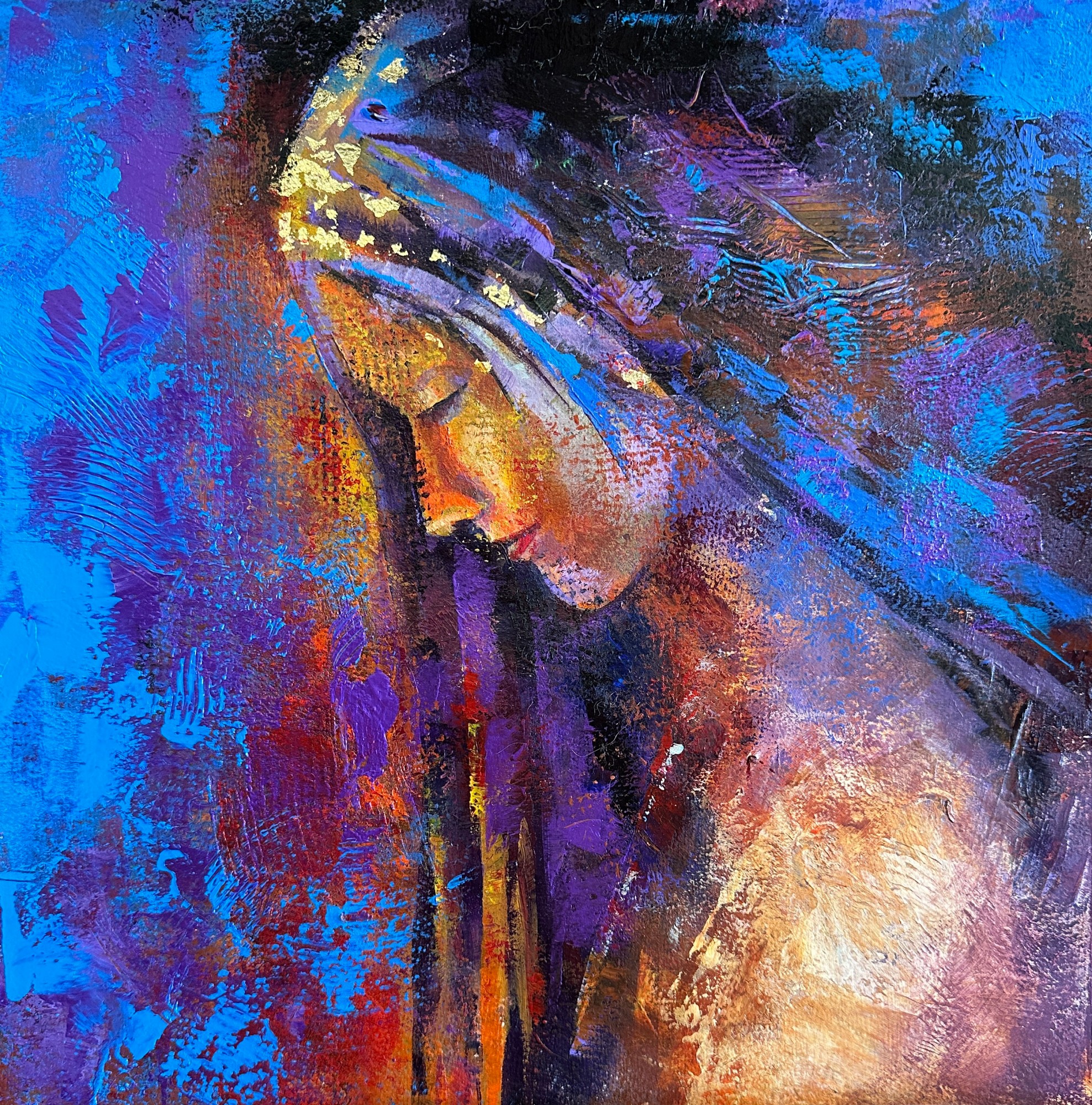 Immerse yourself in the vibrancy of "Solace," a textured painting featuring a profile in an abstract style. Bold colors and dynamic brushstrokes create depth and movement, with warm tones contrasting beautifully against cool blues and purples. Gold leaf embellishments add a touch of luxury to this stunning piece.