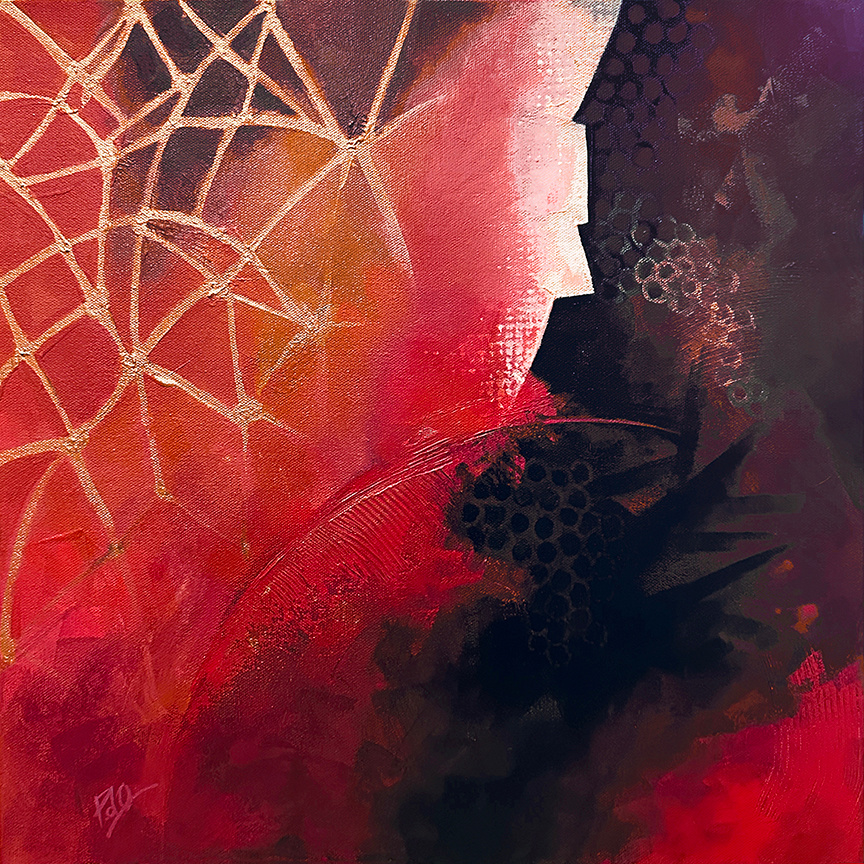 Introducing "Take Courage," a vibrant 18 x 18 inch acrylic on canvas painting that invites you into a world of dynamic colors and textures. An abstract wonderland unfolds as vivid reds and fiery oranges dance with the mysterious allure of deep blacks, while a magical web-like pattern shimmers with golden whispers, suggesting untold adventures. Contrasting black shapes add depth and mystery, creating a lively gathering of hues that tells a soulful story. This artwork encourages contemplation of life's intricate web, inspiring with its bold colors and rich layers to navigate courageously and find joy in the journey.