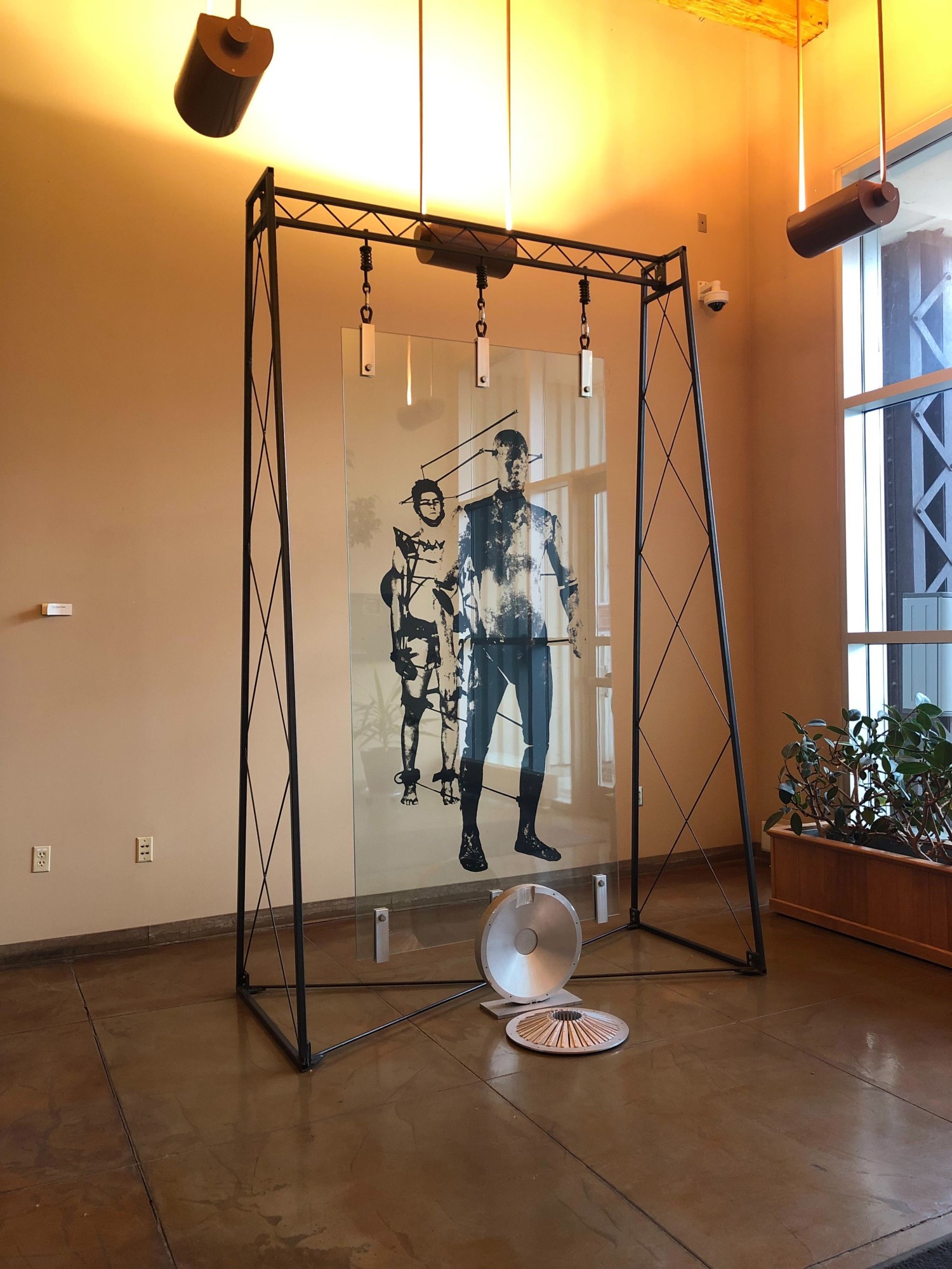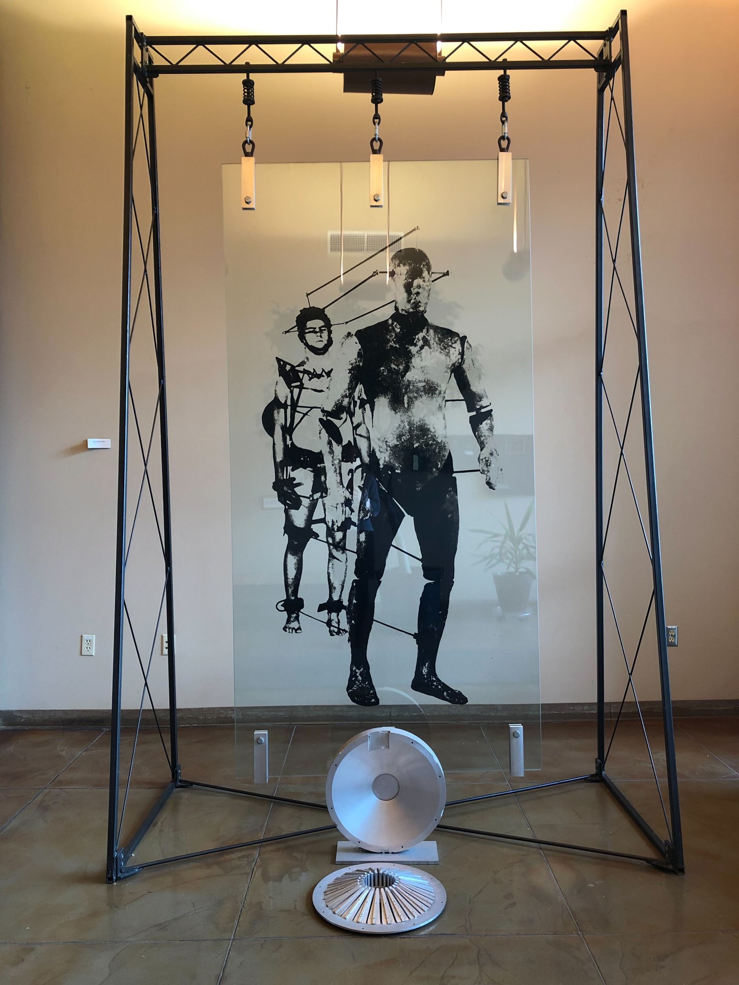This work comprises of a black metal frame with a large sheet of glass suspended inside. There is a black image printed onto the glass, illustrating a picture of artist Colin Piepgras connected to a robot “doppelgänger.” This robot moved with Piepgras through bars connecting the two. They are linked from various points on their heads, legs, and arms. Piepgras would put on performances with this work, walking down streets attached to his body double.