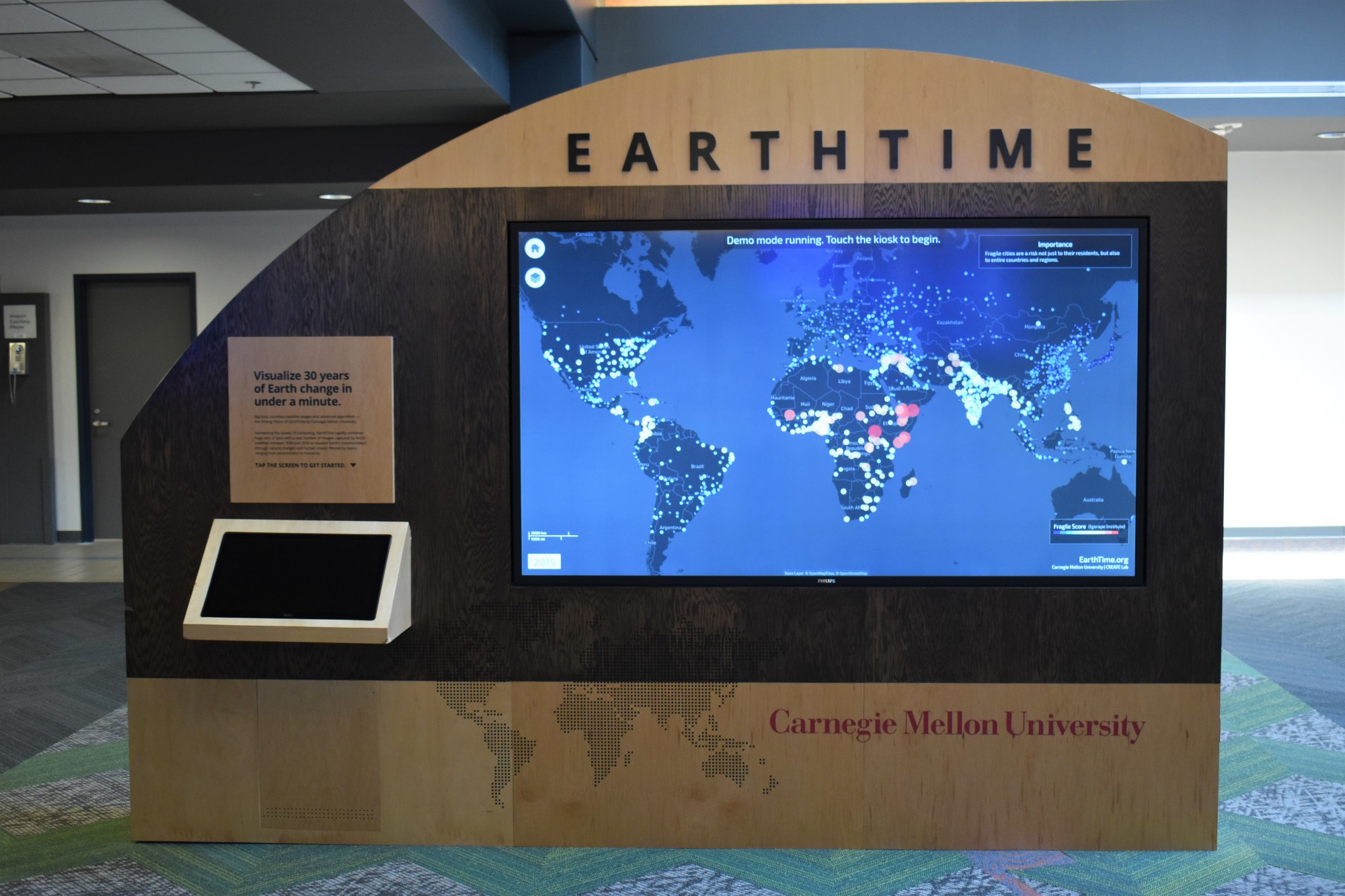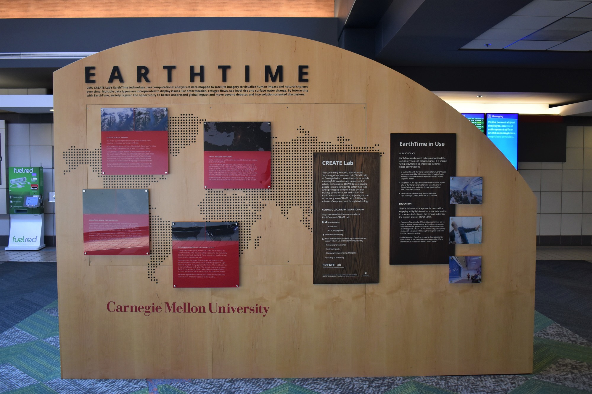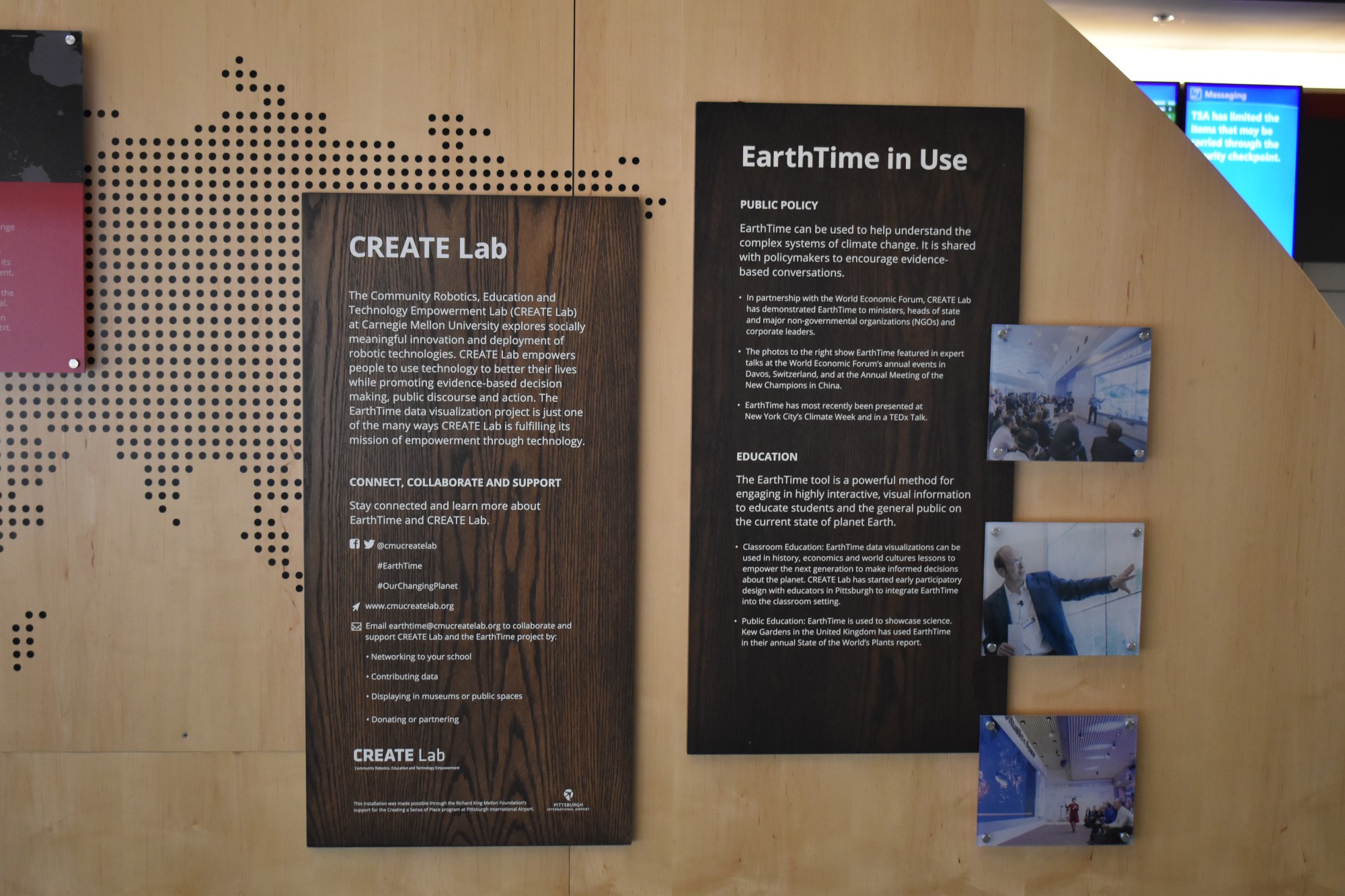 Earth Time is an interactive exhibit designed by Carnegie Mellon University. The display educates visitors on climate change and was based off data found by CMU’s CREATE Lab. Earth Time can be found in the Airside terminal at Concourse C.