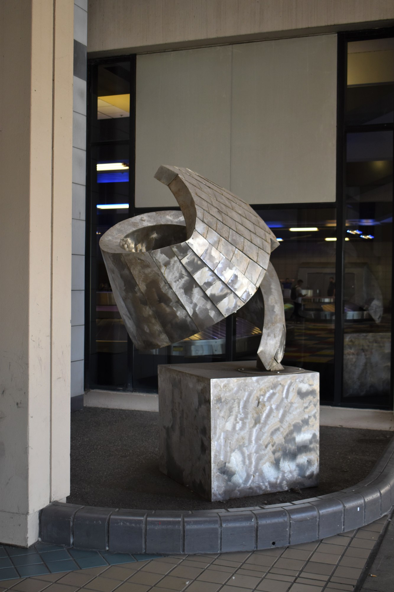 Home is a sculpture made of expertly welded sheet metal by Gillian Christy. Christy incorporates concepts that center around pathways, growth, connectors, and movement. Home captures the hustle and bustle of motion.