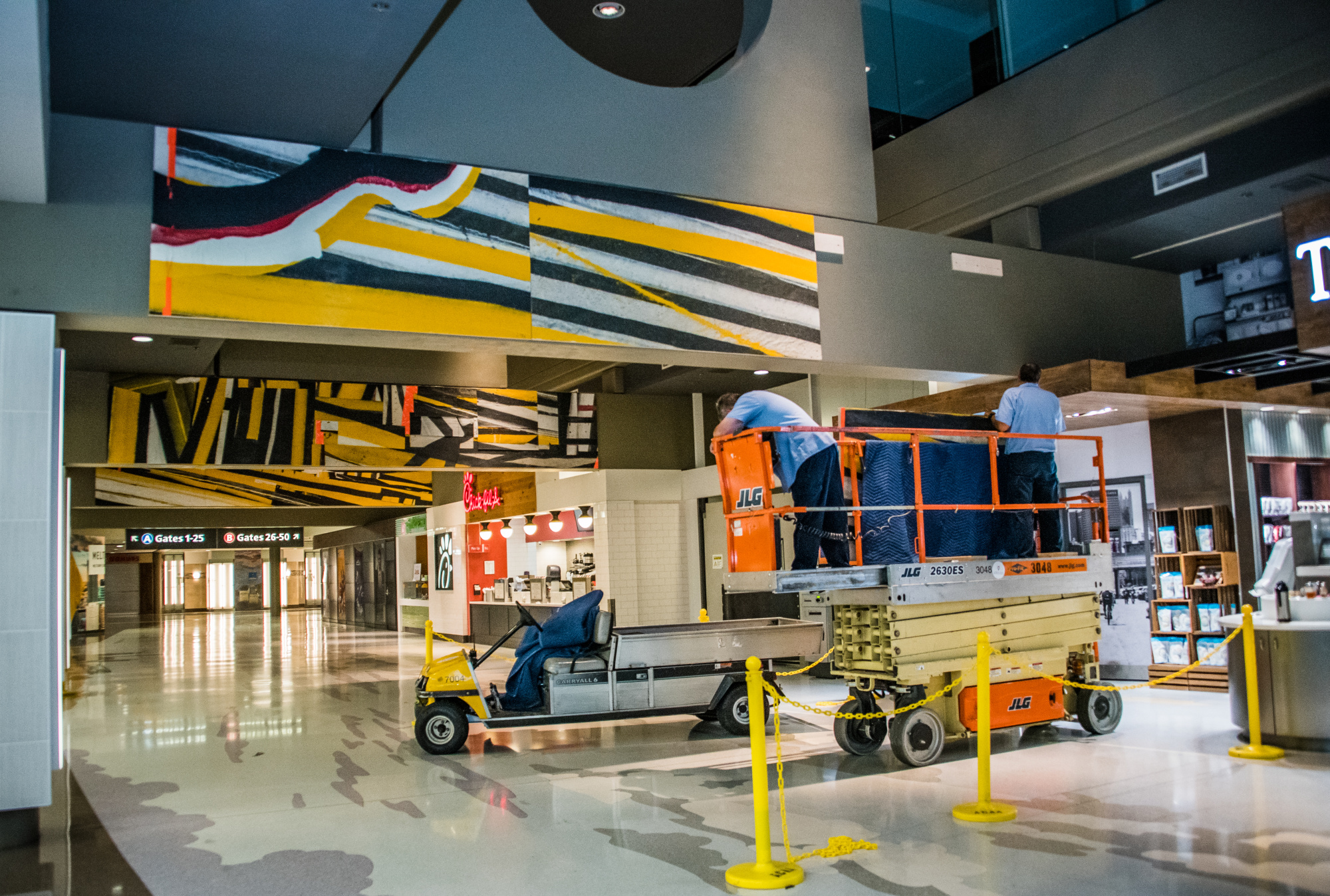 This piece consists of three separate sections, all consisting of collaged imagery from the paint pad. This work is primarily black, white, and yellow lines, with some touches of orange as well. and other surfaces. Industrial Paintings can be found in the Airside Terminal at the Center Core.