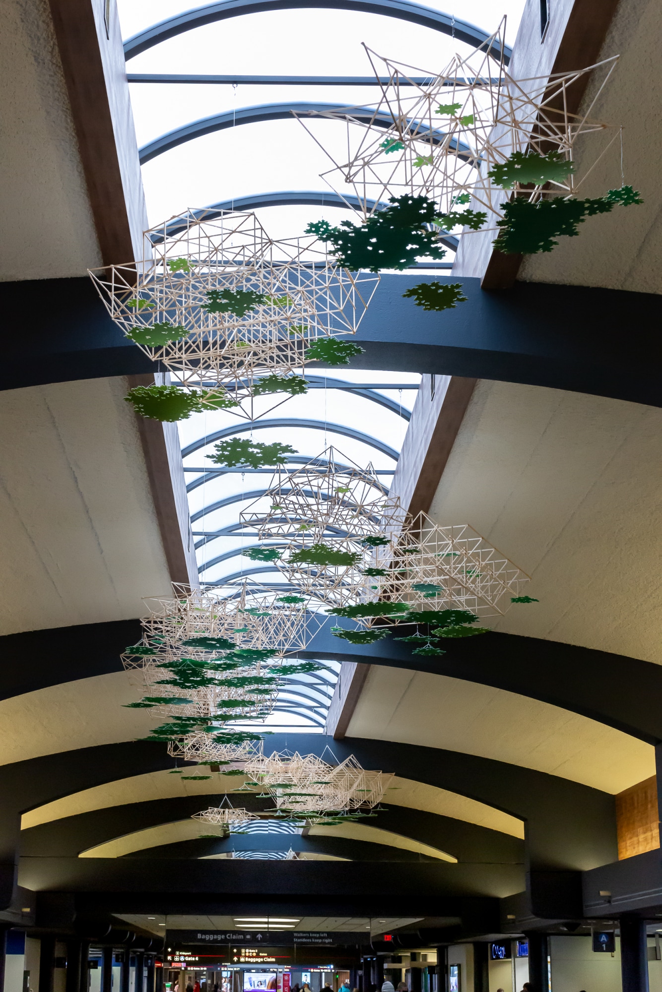 Shy Canopy is a suspended under a skylight that is inspired by the act of looking up into a tree canopy in the sunlight. Each of the 13 modules consists of a wooden spaceframe structure with multiple suspended elements that reference leaf clusters. Made of wooden pieces put together in a way that is reminiscent of bridge trusses, this piece hangs from the ceiling. Flat clusters of green leaves float from tin wires and move as there are changes in airflow.