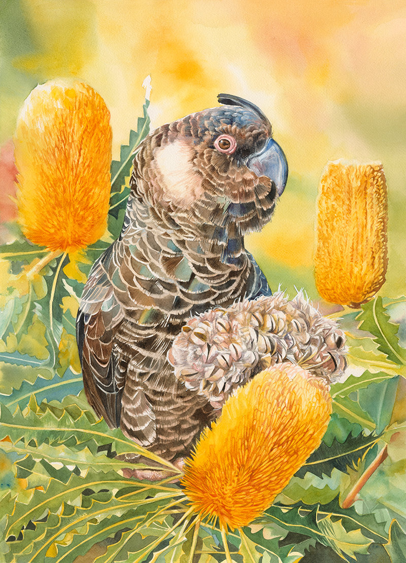 The Carnaby's Black Cockatoo is a favourite of mine. An endangered species, I have a special interest in their conservation and I'm very lucky to have them as regular visitors. One of their favourite foods are banksia seeds and the title of this painting references Enid Blyton's fiendish book characters from the childhood classic Snugglepot ans Cuddlepie. The "Big Bad Banksia Men" were multi-eyed bad guys based on banksia cones such as the one being eaten in this painting. Here we see a beautiful cockatoo combating evil!