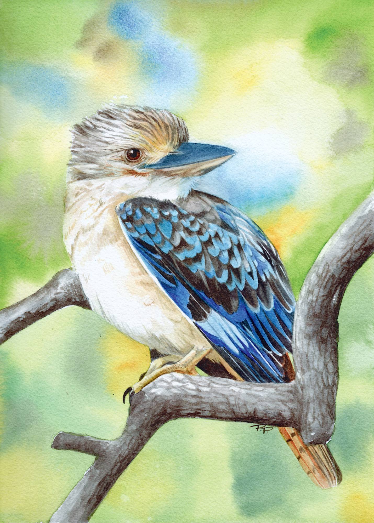 A native Australian bird belonging to the Kingfisher family, this realistic watercolour painting of a Blue Winged Kookaburra has soft tones and a diffuse background. It is created with professional grade paints on 300gsm premium cotton paper, all ready for your choice of framing.