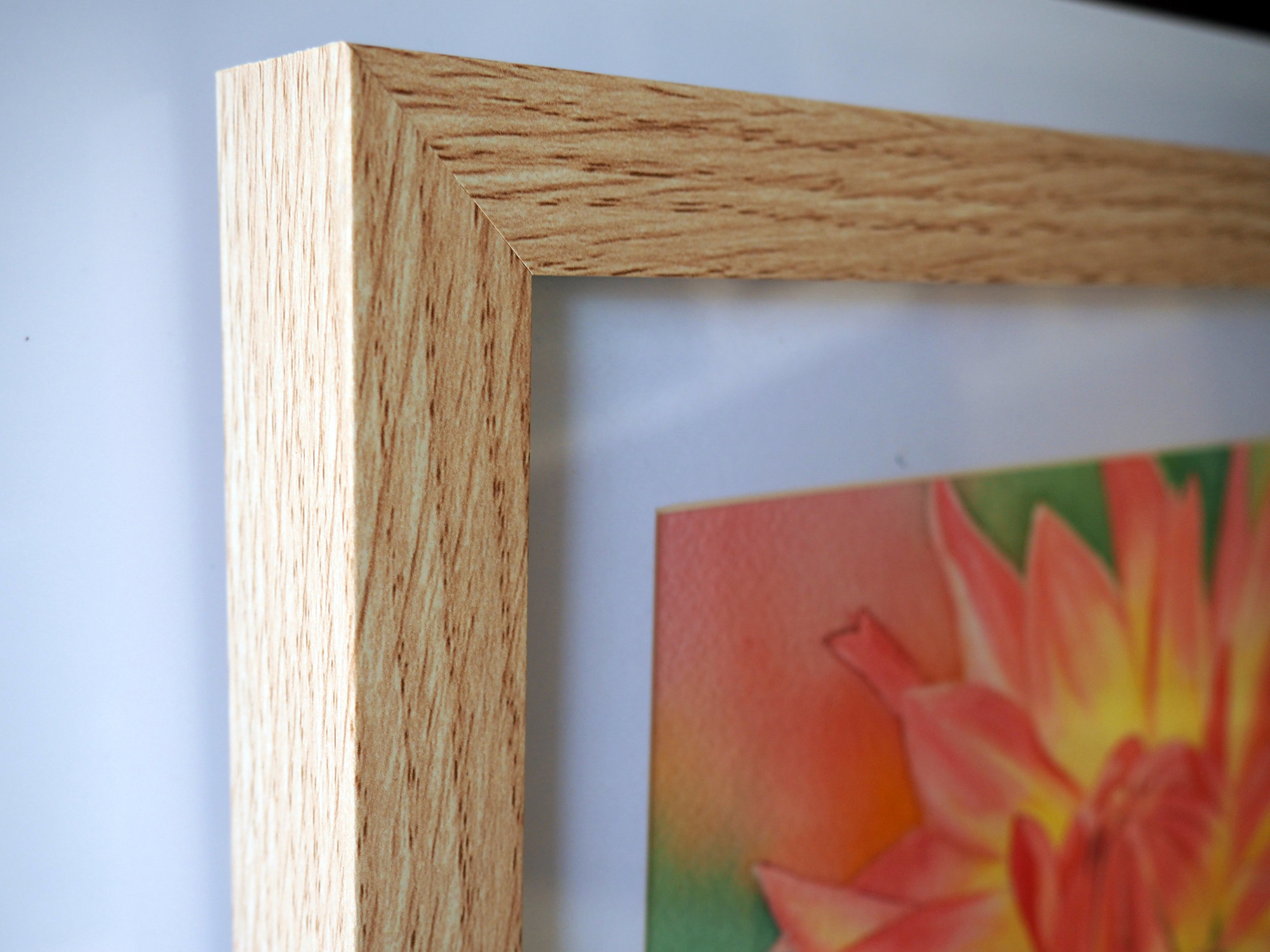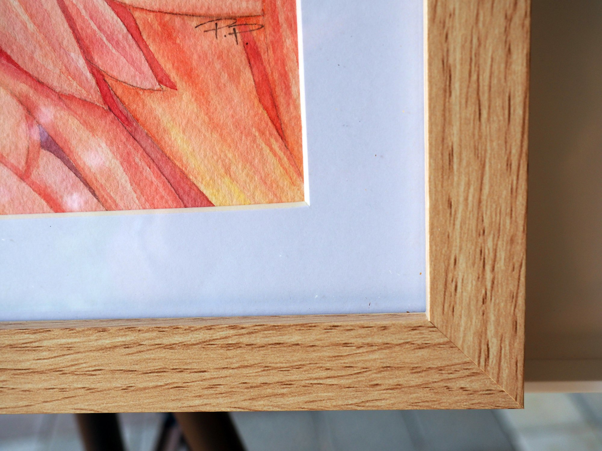 Painted in watercolour on gorgeous cold-press 300gsm cotton paper, In Full Bloom is presented in a square stock frame with a simple, classic profile in a mid-tone, wood-look finish, a glass front and multiple hanging options (saw-tooth hanger, d-rings and wire rope).