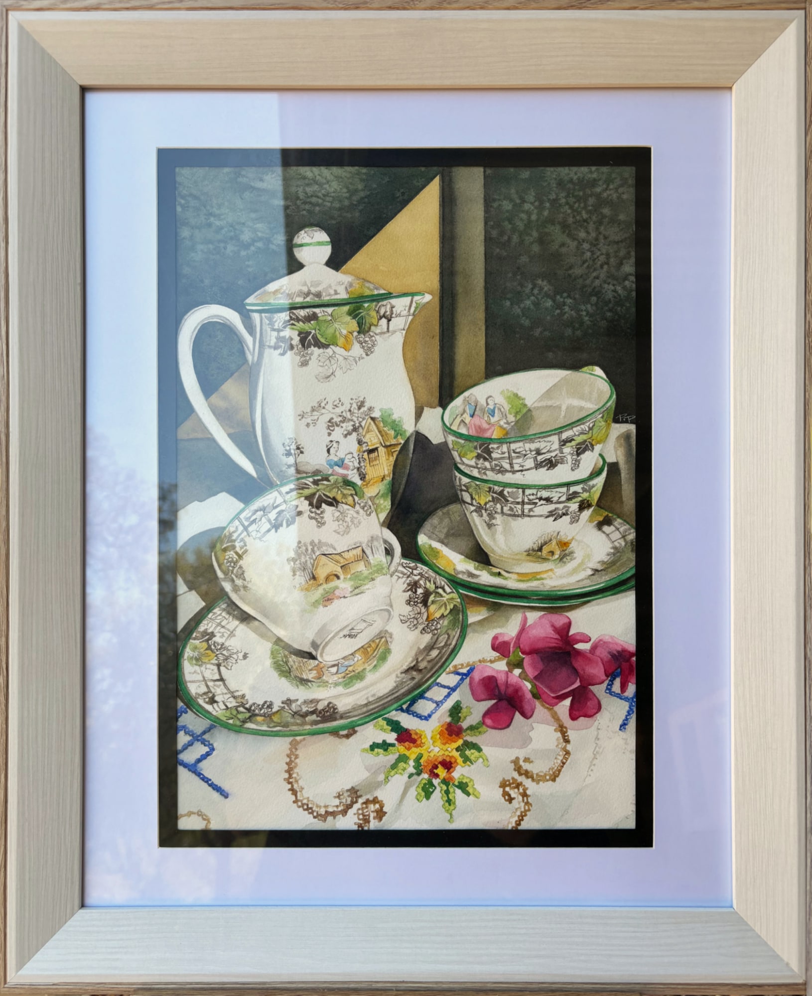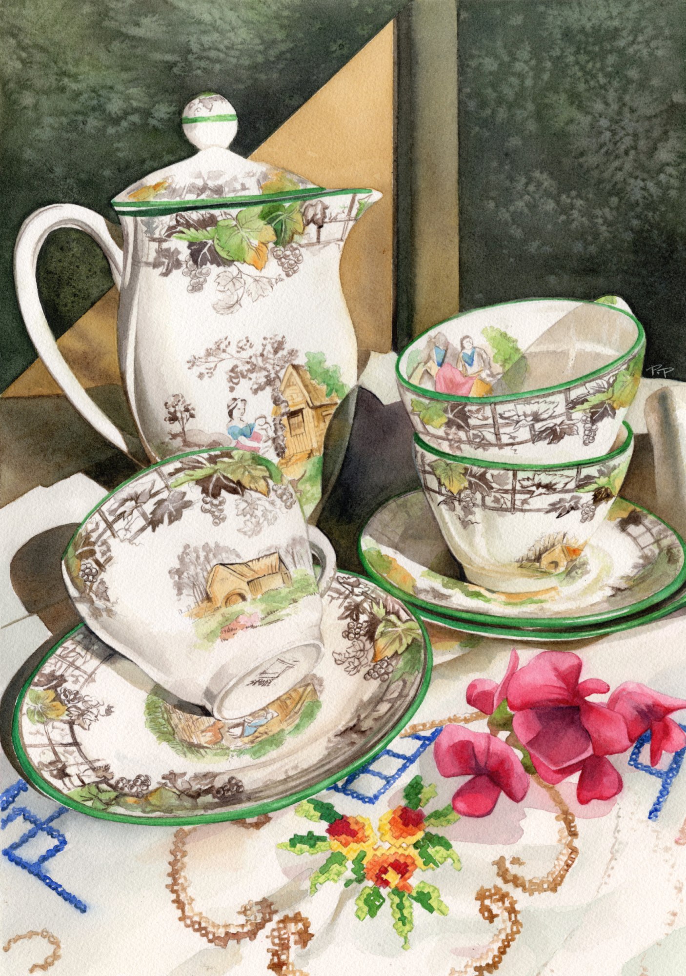 My grandmother was a lover of fine china and she purchased this Spode dinner set on her 21st birthday. Not a huge amount of these sets exist as the transfer patterns were lost in the second world war. This was a significant inheritance from me and along with the hand embroidered tea cloth she made, and the memory of sweat peas from her garden, this piece is a snapshot of a personal history.