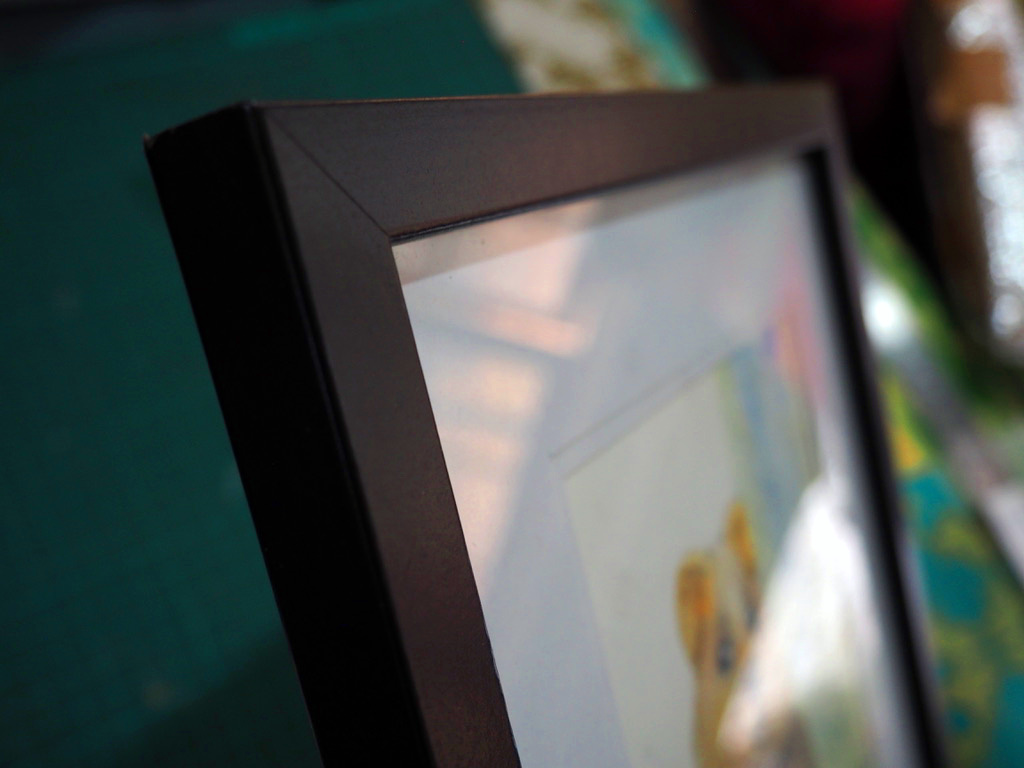 Framed in a stock frame with a double mat. Frame has a black finish, glass front and simple profile that will complement most decor. Frame has both a stand and saw-tooth hanger as display options.