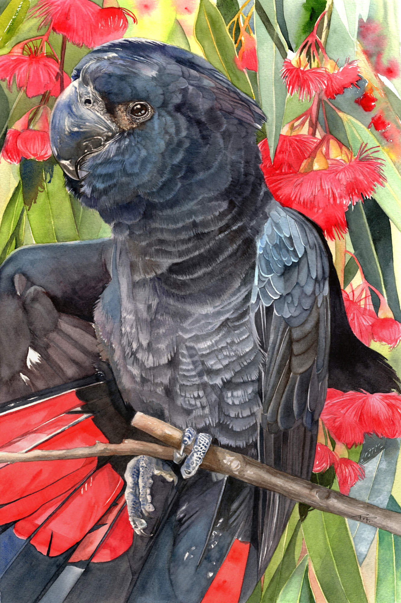 This painting depicts the very striking male Red-Tailed Black Cockatoo amongst a background on pink Eucalyptus (leucoxylon) flowers. These large, loud birds love come to forage (and be terribly destructive) in our trees, but as an increasingly rare species, they are most welcome.