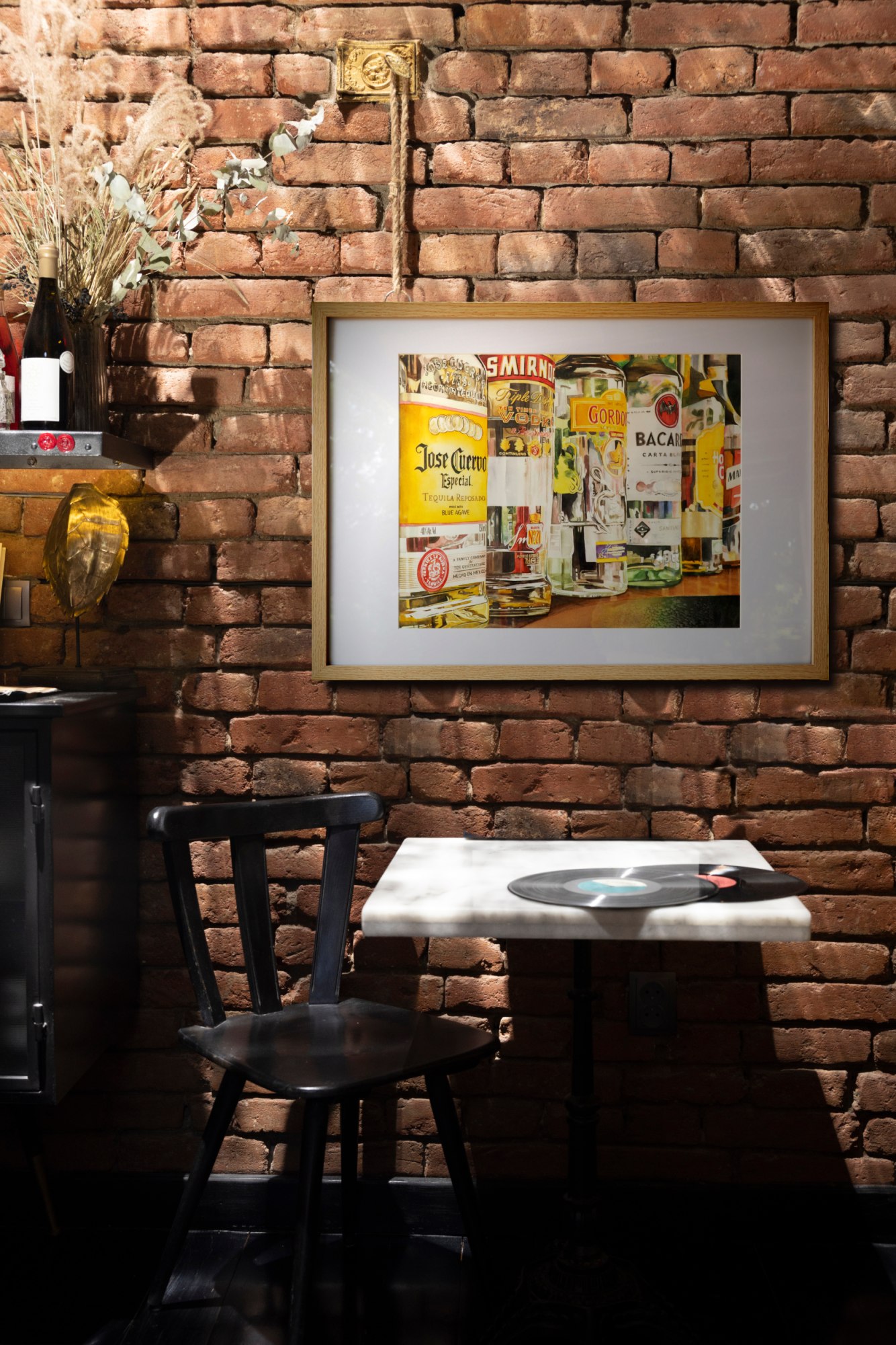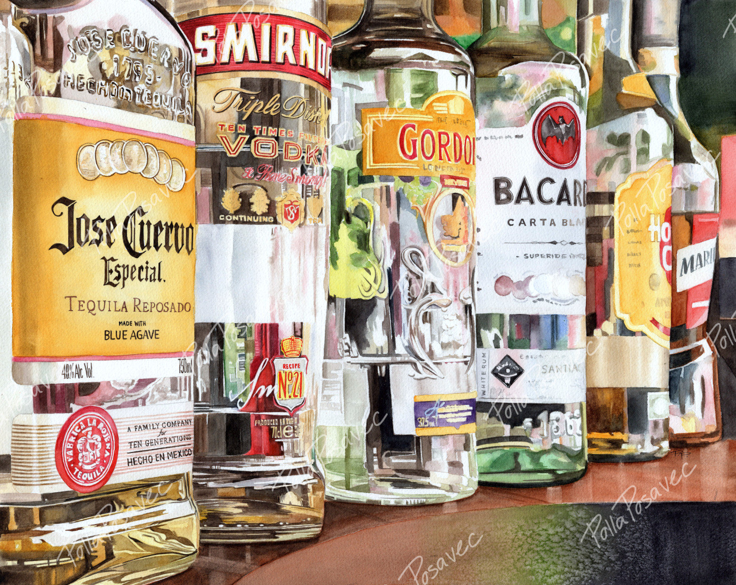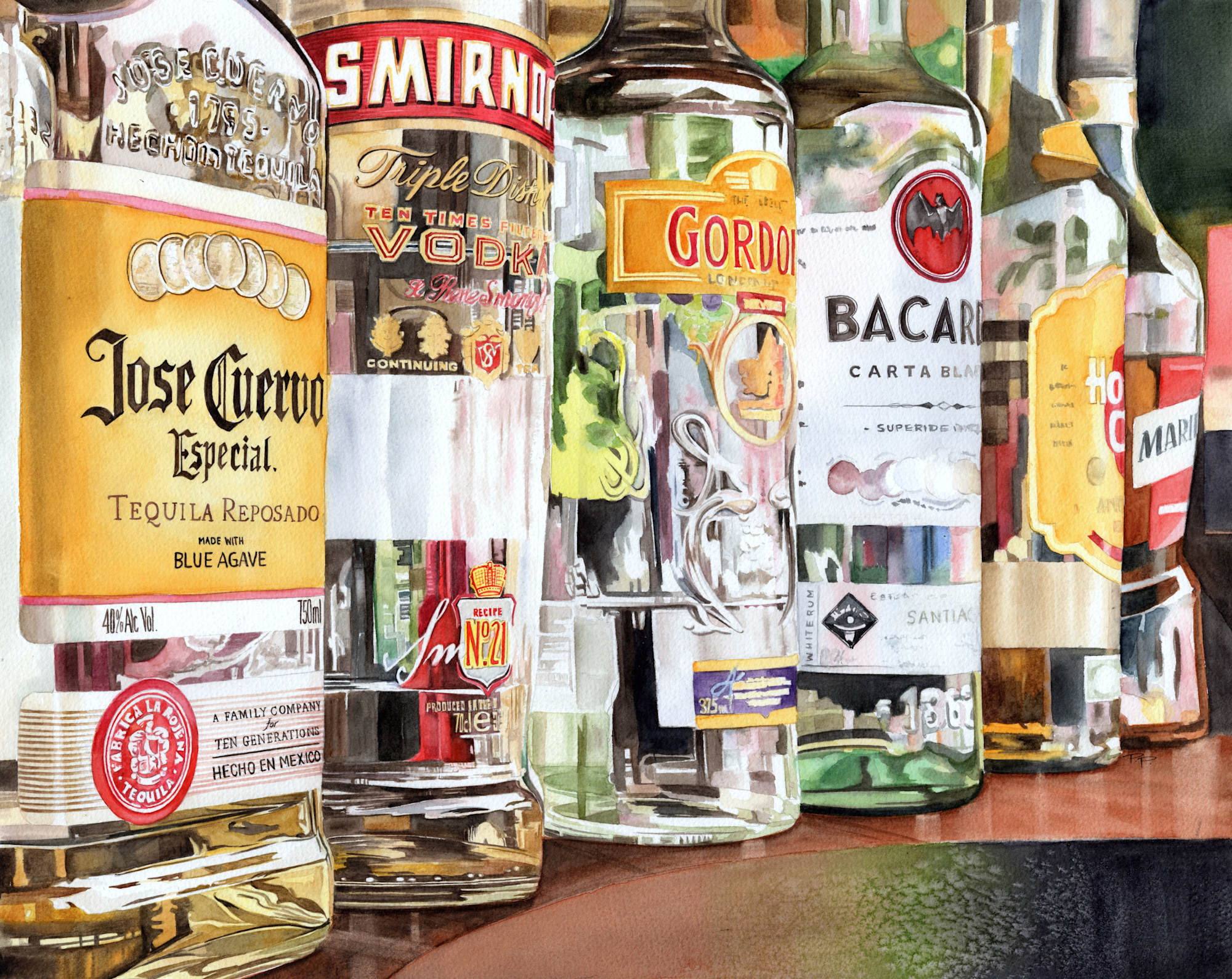 I have a fascination with rendering glass, and I couldn't resist this amazing stock photograph as a subject. The rich colours and shapes of the spirit bottles and the complex typography lead to a complicated and dedicated journey on the easel. It is a personal favourite of min, as I spent many hours in its company and I appreciated the challenge.