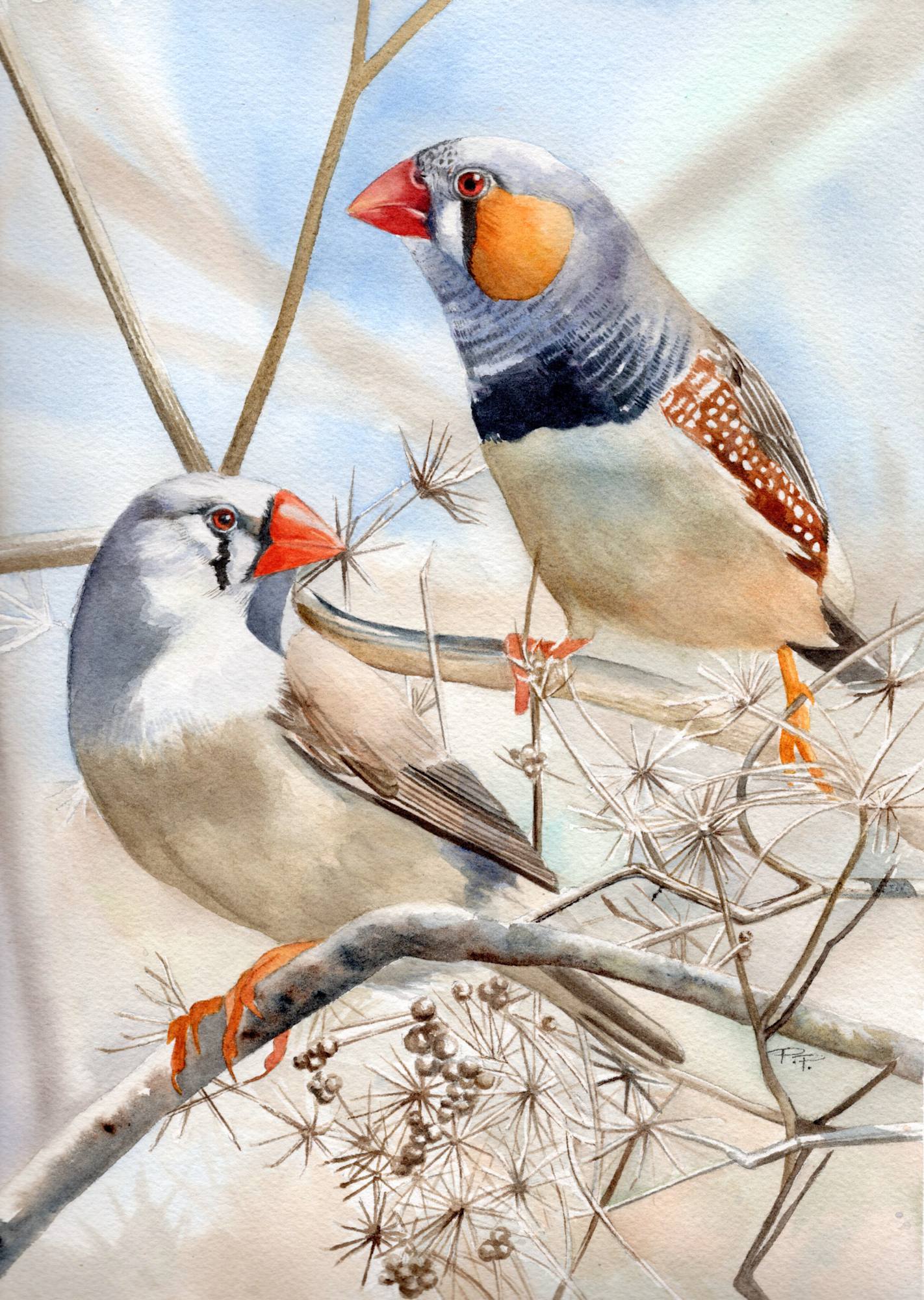 We're just a little too far south in Western Australia to have these birds as visitors in the yard, but it doesn't take too much travelling. When I was little child we kept a few pairs as pets, and their cheerful honking tweets are etched in my memory. They're only tiny birds - this painting is larger than life - and their warm colouring and distinctive markings are quite beautiful.