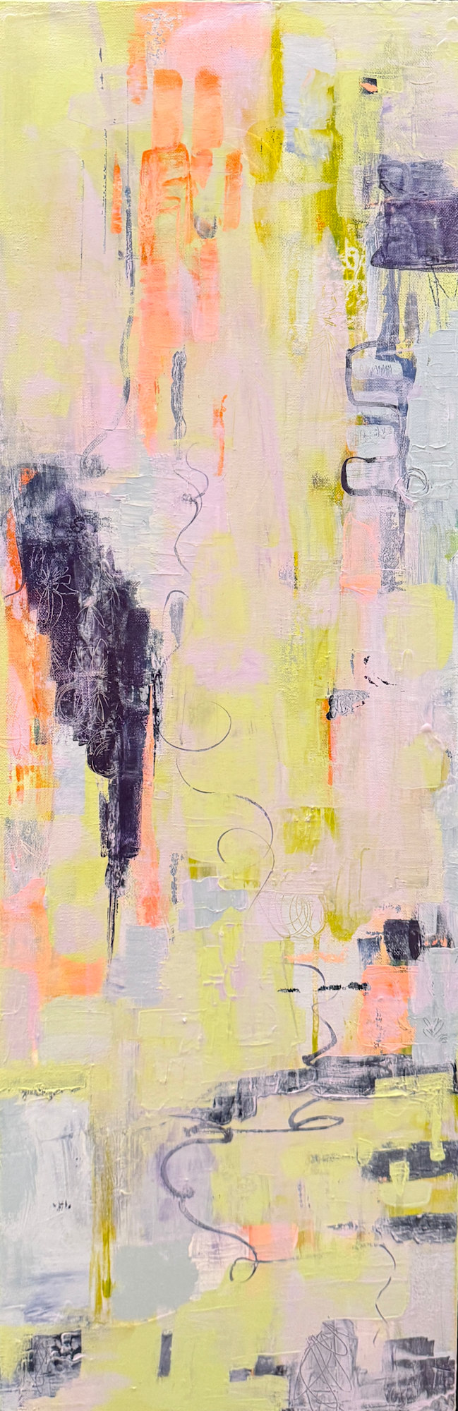 Dancing Light is a radiant counterpart to Shifting Seasons. Lines and organic marks skip across layered surfaces, catching flashes of brightness that shimmer like sunlight in motion. This acrylic painting embodies joy, resilience, and the beauty of illumination from within — a reminder that our own light changes in rhythm, yet never disappears.