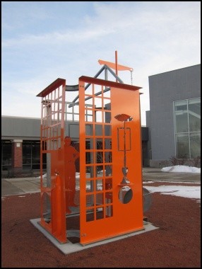 First exhibited at the Pier Walk in Chicago in 1998, then the former location of the Nebraska Arts Council at the Joslyn Castle. The sculpture, which is large enough to enter and examine the icons, is an homage to the American constructivist sculptor David Smith. In 2012, this piece was moved from the Gene Leahy Mall to Metro Community College at 27th and Q.