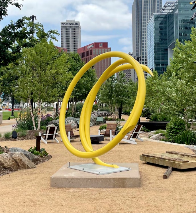 One of five large sculptures on-loan for a 3-year installation in the revitalized Gene Leahy Mall at The RiverFront beginning in July 2022 . The loans were made possible by a partnership between the Metropolitan Entertainment & Convention Authority, KANEKO, and the International Sculpture Center.