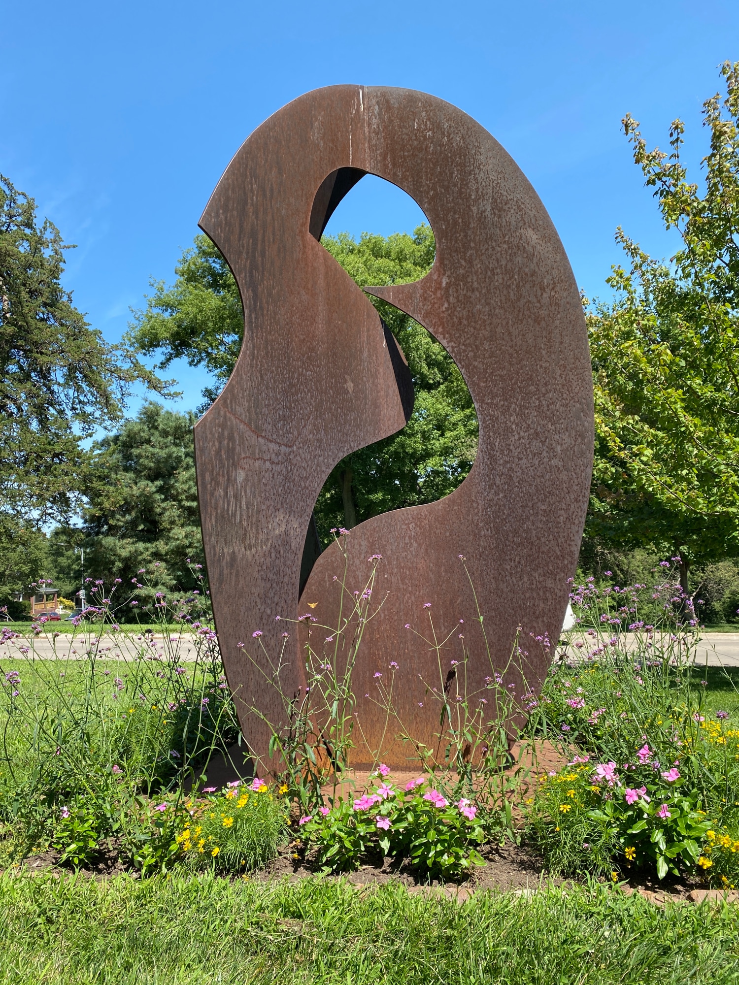 This sculpture was created in the three year period during which the artist, originally from New York, lived in Nebraska while working to earn his graduate degree from the University of Nebraska at Lincoln. Praxis, which is about contemplation shifting into movement, is one of four metal sculptures by the artist located in Nebraska.