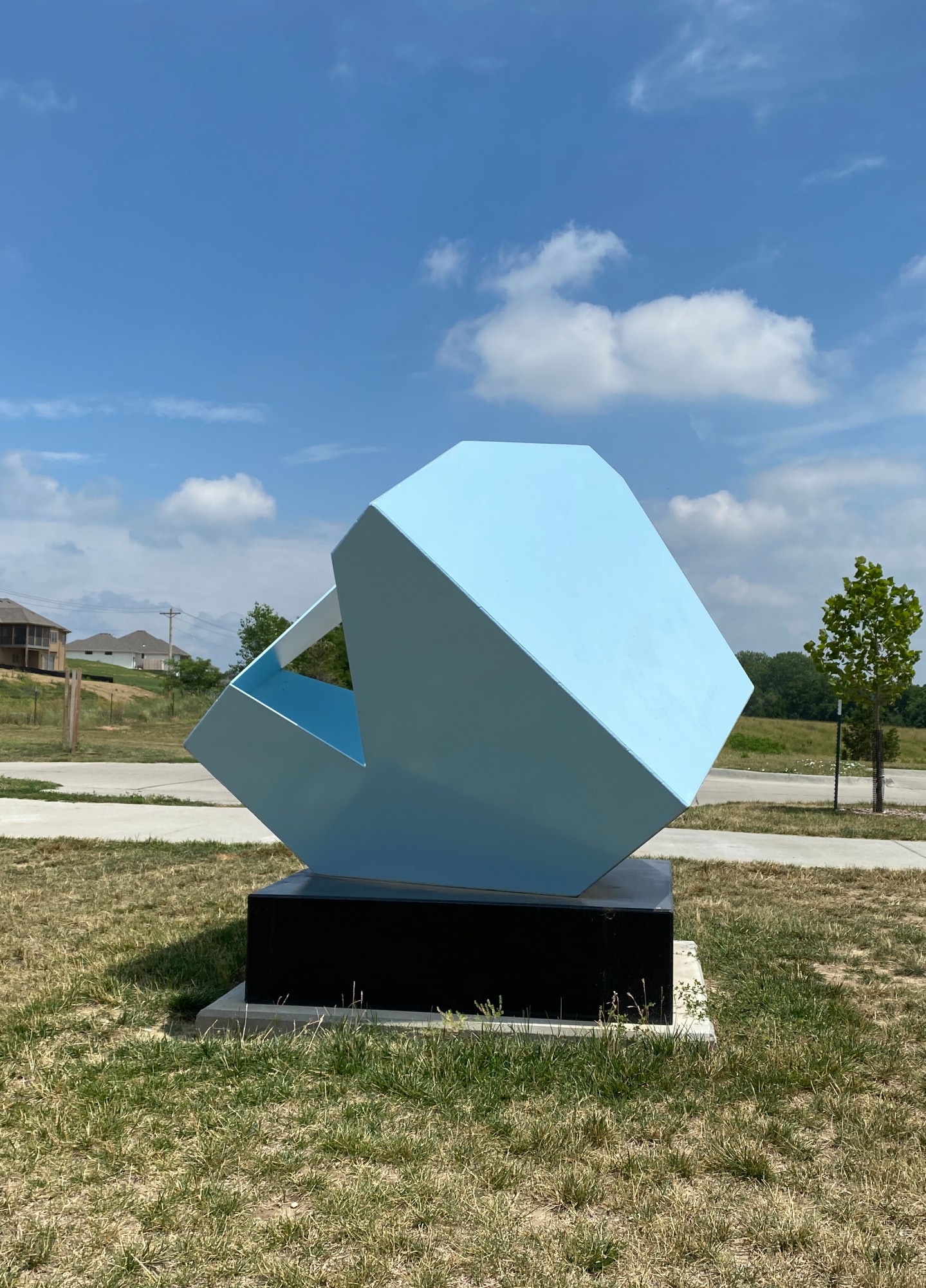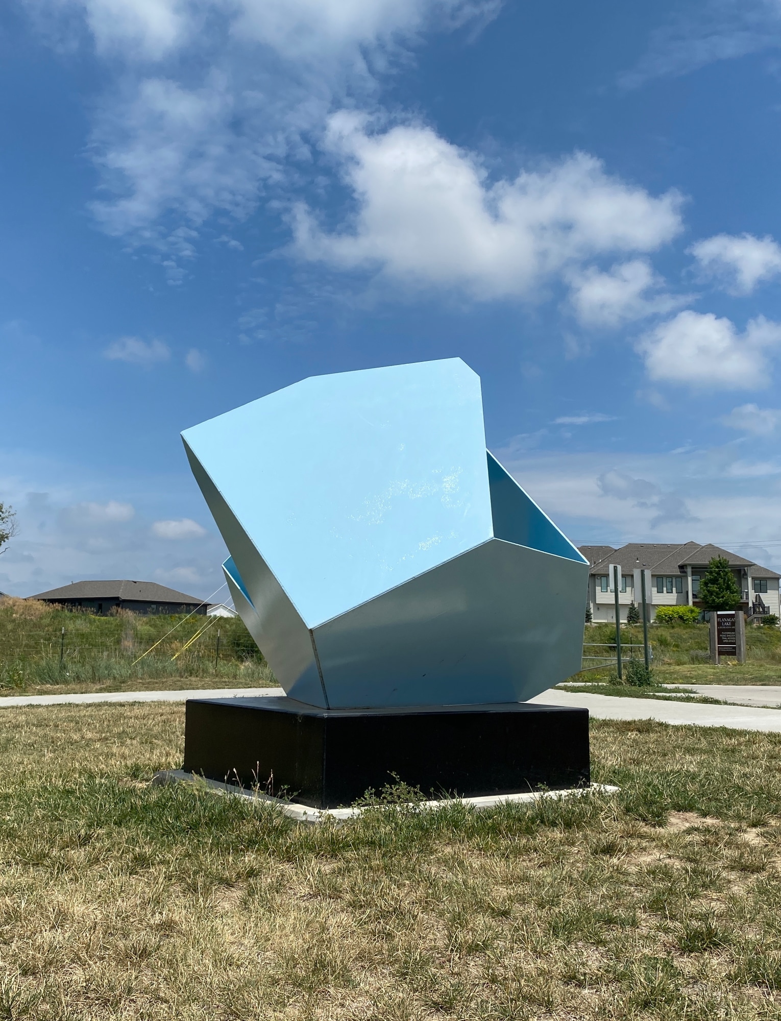 "Shadow Box" was installed in the Gene Leahy Mall in 2005 as part of the Wind & Water Sculpture Project (2002-05) created in conjunction with the Omaha Summer Arts Festival. It was moved from that location when renovations to the mall began in 2019, and placed in its current location near the playground at Flanagan Lake.