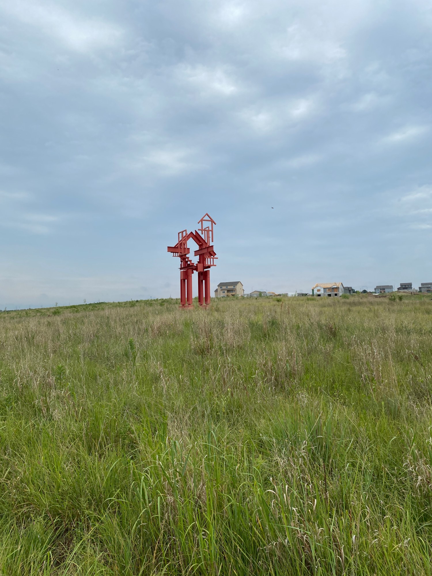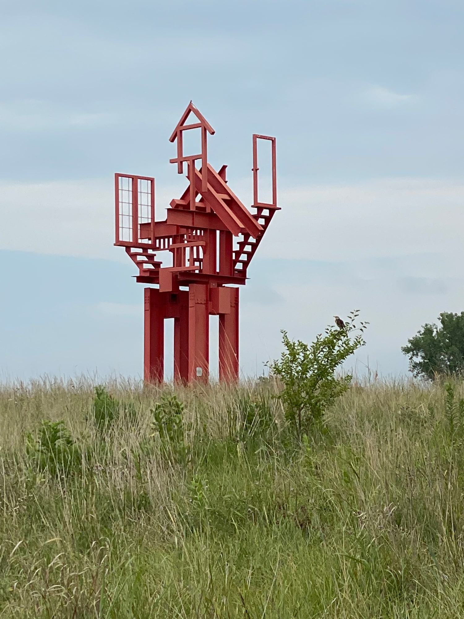 This geometric welded steel sculpture, described by the artist as “a great big red line drawing, is comprised of many different open linear shapes.
