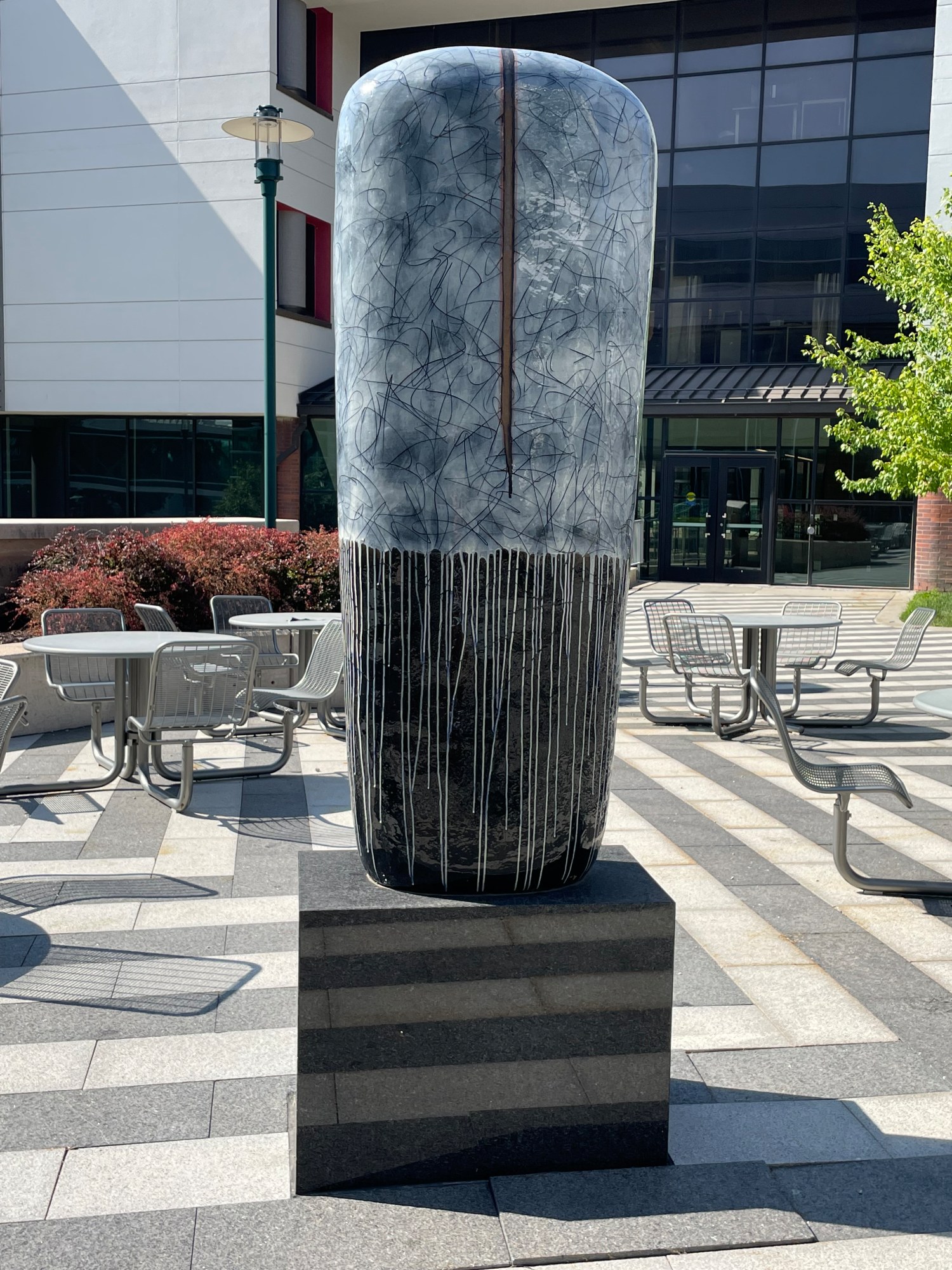 This installation consists of three dangos, a ceramic form whose name literally translates to dumpling, after the round or oval shapes similar to the rice pastries eaten during Japanese tea ceremonies. The Dangos are paired with geometric patio paving.