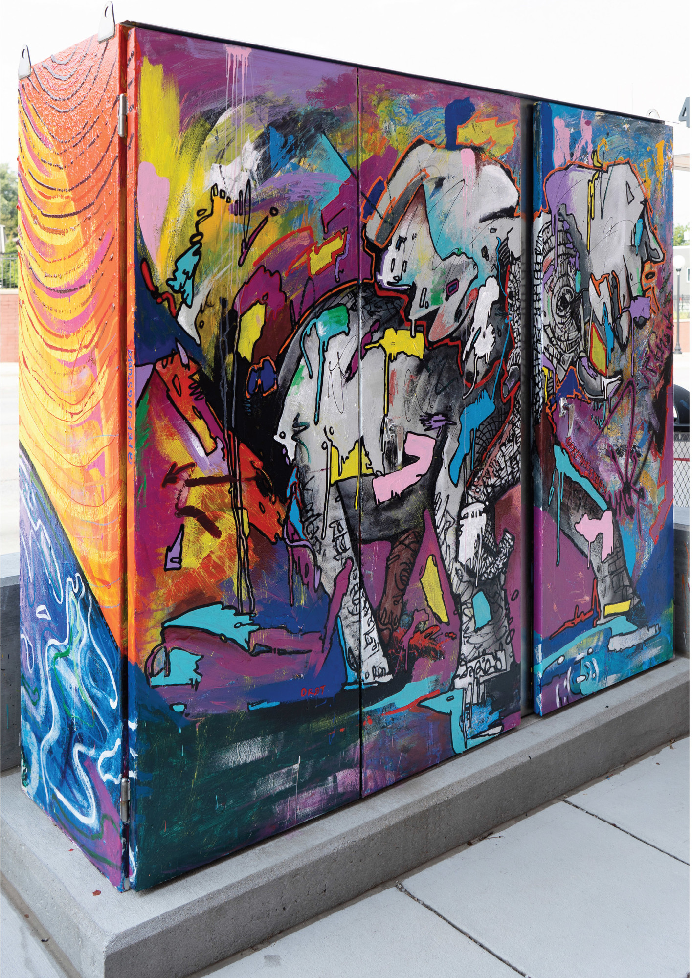 This artwork is one of a series of utility box wrap murals commissioned by Omaha by Design's Art+Infrastructure public art initiative, with the goal of beautifying Omaha’s “in-between spaces” to help neighborhoods to become more connected, residents to feel safer, and visitors to experience moments of joy. The wraps were completed in partnership with Metro to complement the new ORBT rapid bus transit lines by adding original art to stations along the East/West Dodge Street line.
