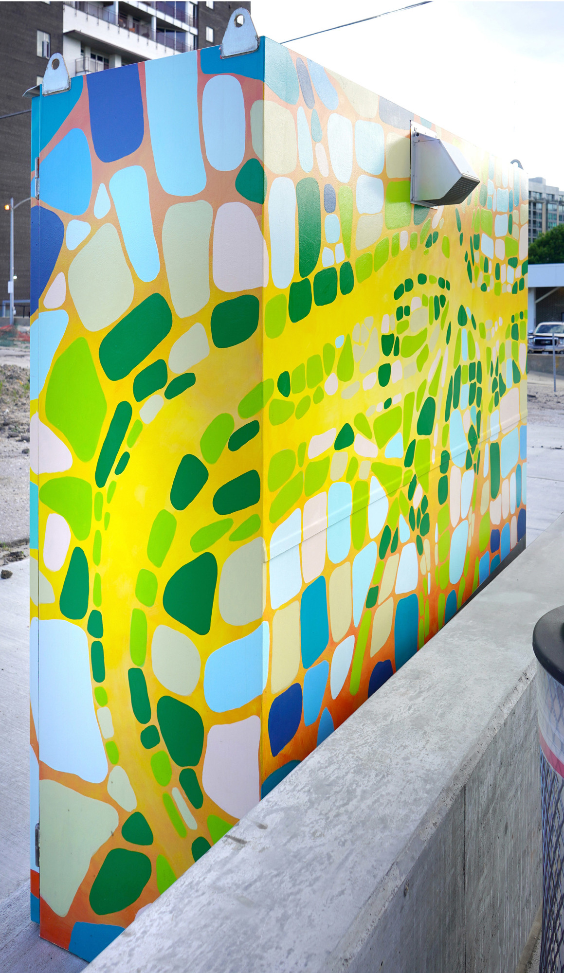 This artwork is one of a series of utility box wrap murals commissioned by Omaha by Design's Art+Infrastructure public art initiative, with the goal of beautifying Omaha’s “in-between spaces” to help neighborhoods to become more connected, residents to feel safer, and visitors to experience moments of joy. The wraps were completed in partnership with Metro to complement the new ORBT rapid bus transit lines by adding original art to stations along the East/West Dodge Street line.