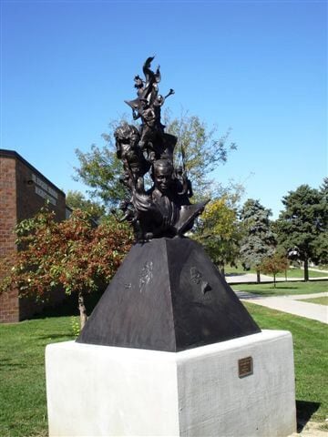 The figures in the sculpture are on a journey through time. Freedom from slavery and oppression move the lower figures upward. Dr. Skinner is holding the book of history and from its pages spring figures representing the struggle for freedom. Harriet Tubman spreads her hands above the suffering slave to gather him onto the Underground Railroad. The large busts of Frederick Douglass and Abraham Lincoln represent the true vision and struggle to right a nation’s sins.
