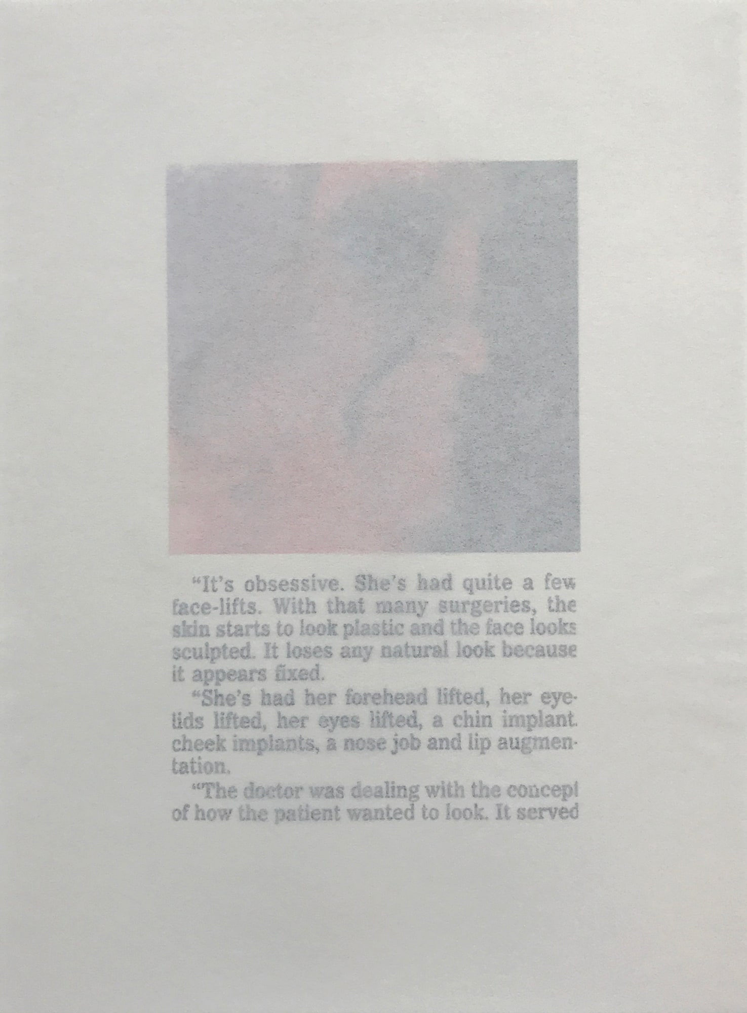 A Pack of Lies is a portfolio of prints including this version of an aged Barbie-like portrait. Meimaroglou often depicts the kinds of violence that objectifies women. This computer-modified photograph and generated image transformed into a screenprint shows the idealized “Barbie” juxtaposed with the features of an abused woman who appeared to tell her story on a television reality show. It is the facial features of an aged woman who tries under any circumstances to hold onto her disappearing youth, and as such, is a protest against the constraints of the beauty stereotypes imposed on women. Thus, the title of the portfolio A Pack of Lies, which includes six prints housed in an artist-made, cream-colored paper portfolio cover.