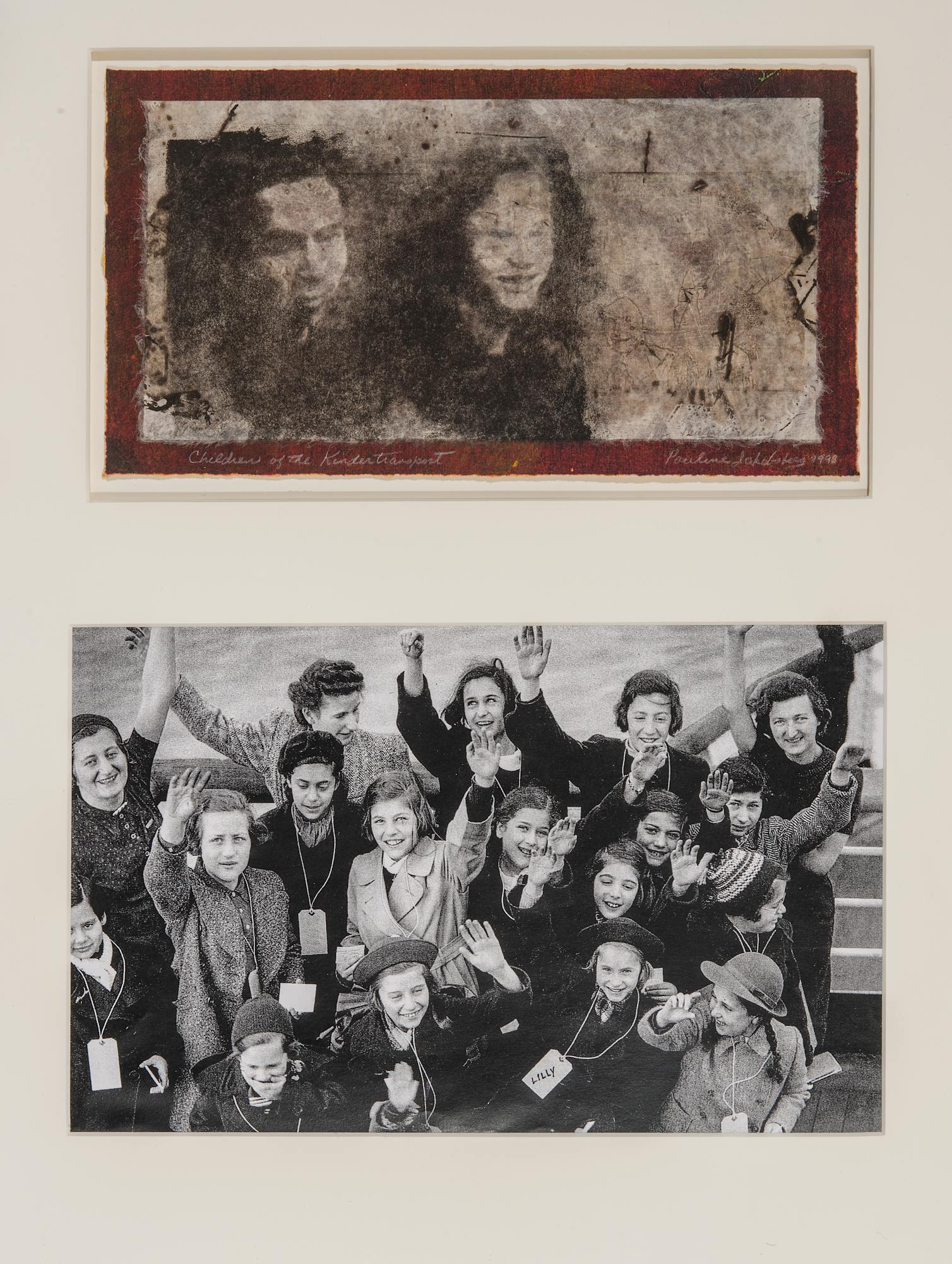 In 1938, England was willing to take Jewish Children up to the age of 16 out of Nazi Germany. This was called Kindertransport. My cousins, Lili, age 11 and Gerd, age 9 were on this ship waving goodbye to their parents who they assumed would follow; but they never did. They were brought up in a foster home. (See Lili in the photo with the tag around her neck.) The silkscreen is from an image of them as older teenagers.