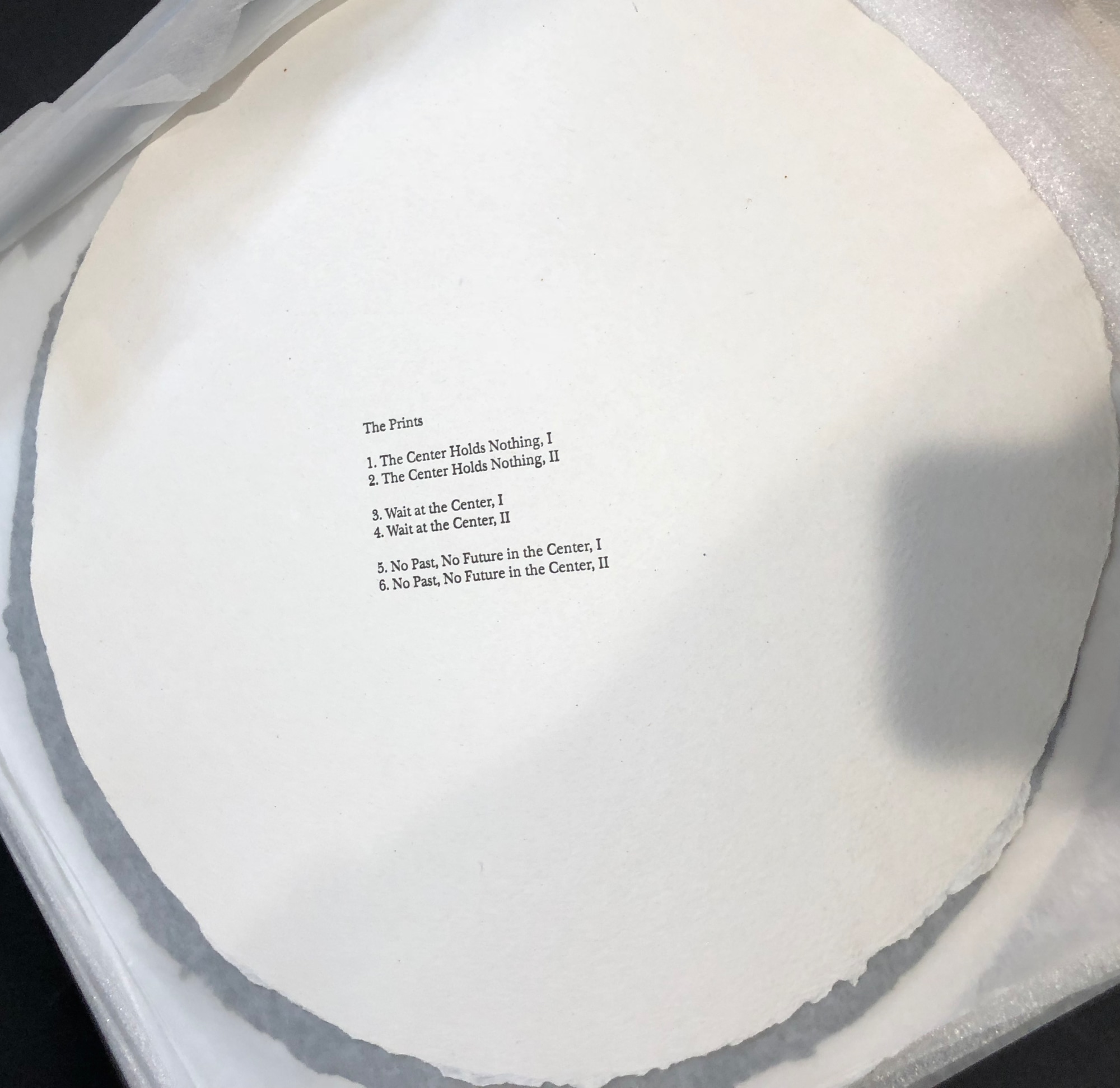 The suite of prints, Fall Back to Center, is inspired by Prentice's research on the ancient tradition of the Mandala as well as her fascination with magical realism. From preliminary sketches made in her studio in Eugene, Oregon, Prentice worked with Gretchen Schermerhorn and other studio artists to carry out a series of images in circular custom-made sheets of paper. Each mandala nature-inspired image was layered with pulp painting and then printed with tonal and line applications of copper-plate etchings produced by the artist. Prentice's long history of combining pulp painting with printmaking, guided the mastery of many hands for an exquisite publication.