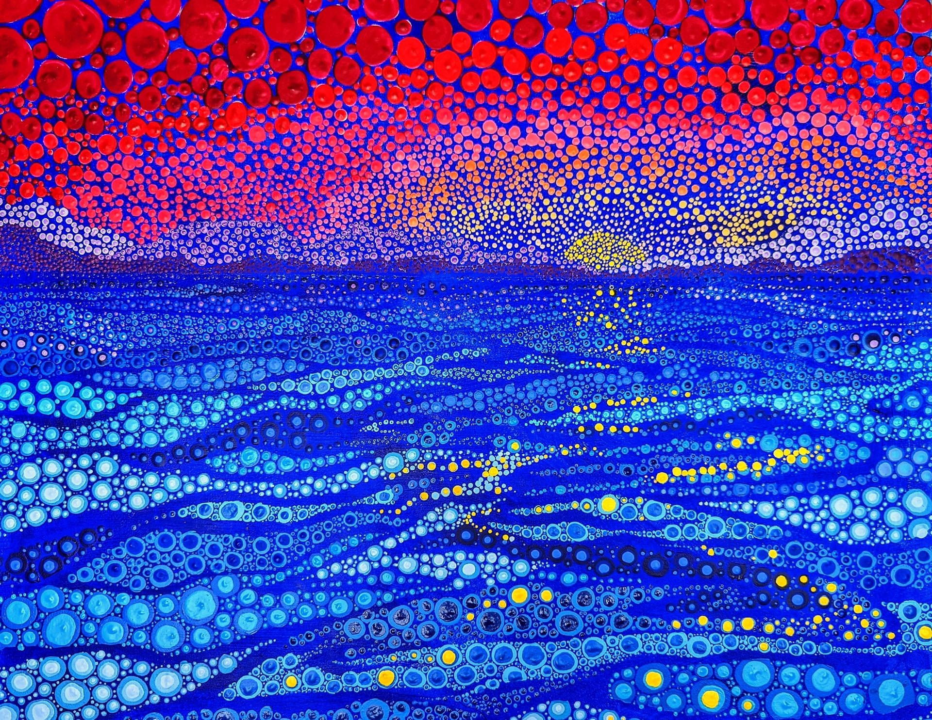 "Just Before" utilizes the artist's signature mark-making impressionist style to capture the feeling and emotion of being in the ocean at sunset. Each "dot" is purposefully and precisely placed, one by one with Acrylic paint and various sized dotting tools.