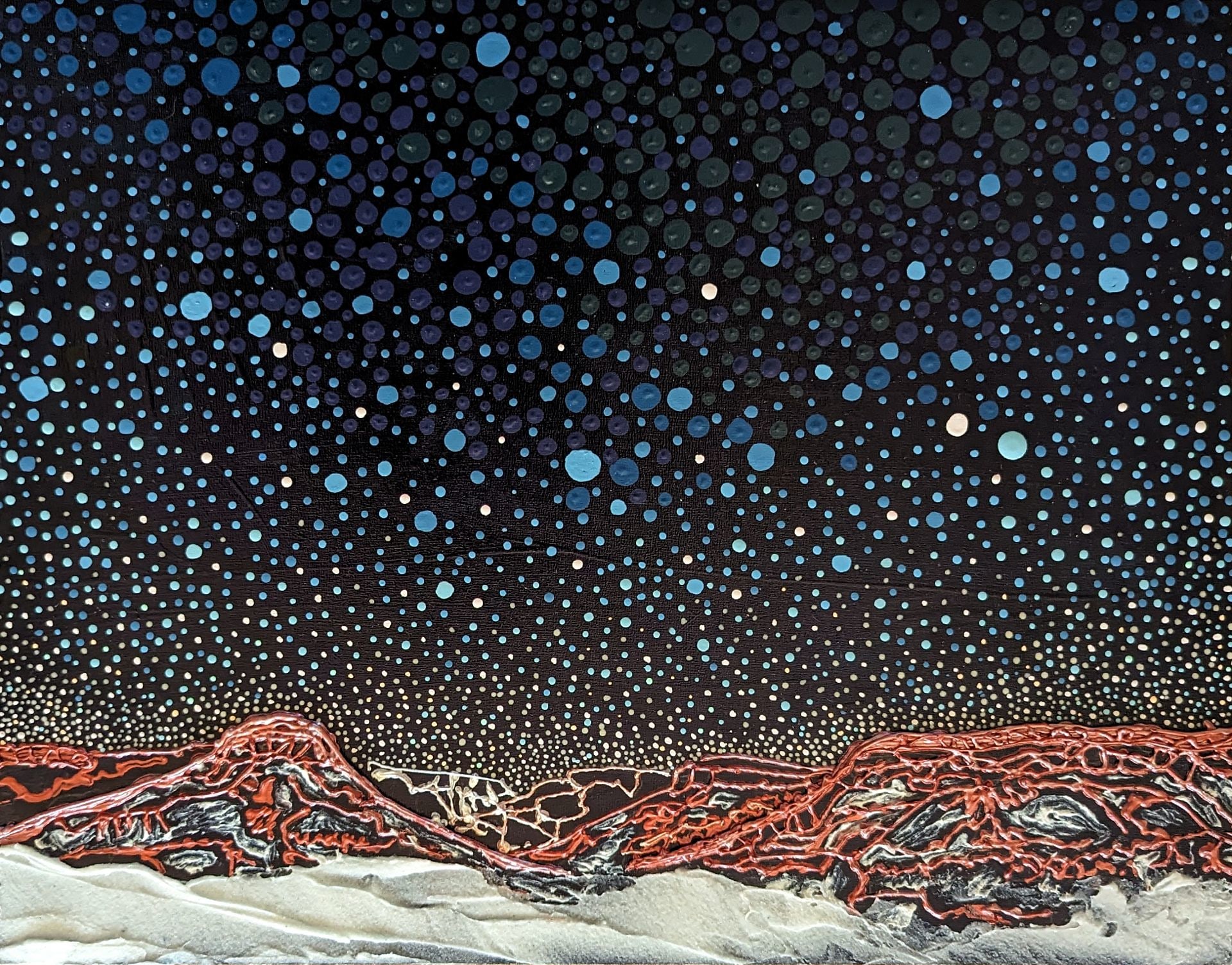 Combination of a subtle but powerful color palette of dots to set the ambiance of the quiet, calm, stillness of a snow-covered landscape. 3D acrylic paint is used to delineate the front range plateaus and not fully opaque texture paste is used to model the enigmatic way of fallen snow.