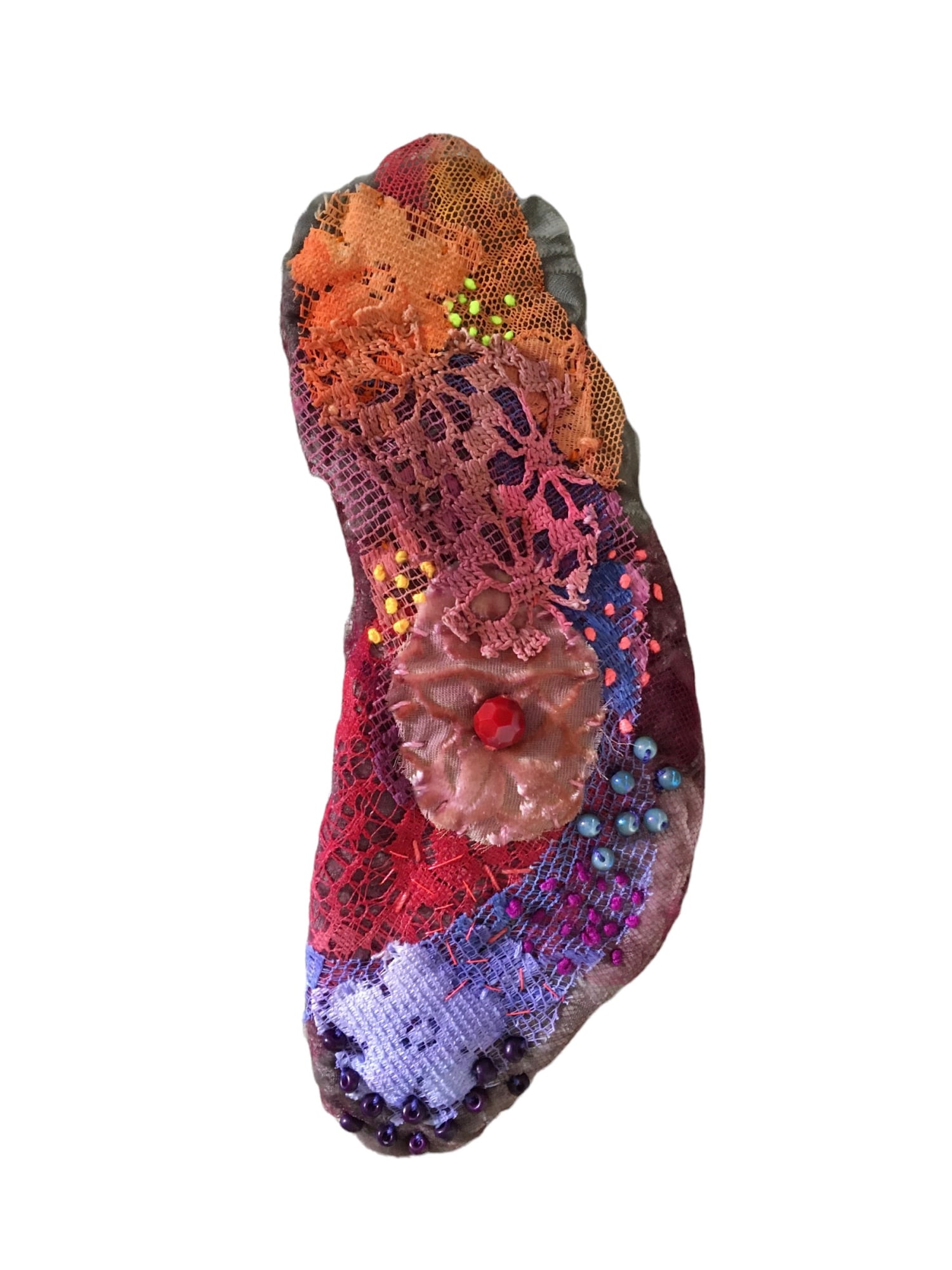 Heirloom textiles, vintage and salvaged fabrics, vintage lace, glass beads with mixed recycled fiber batting