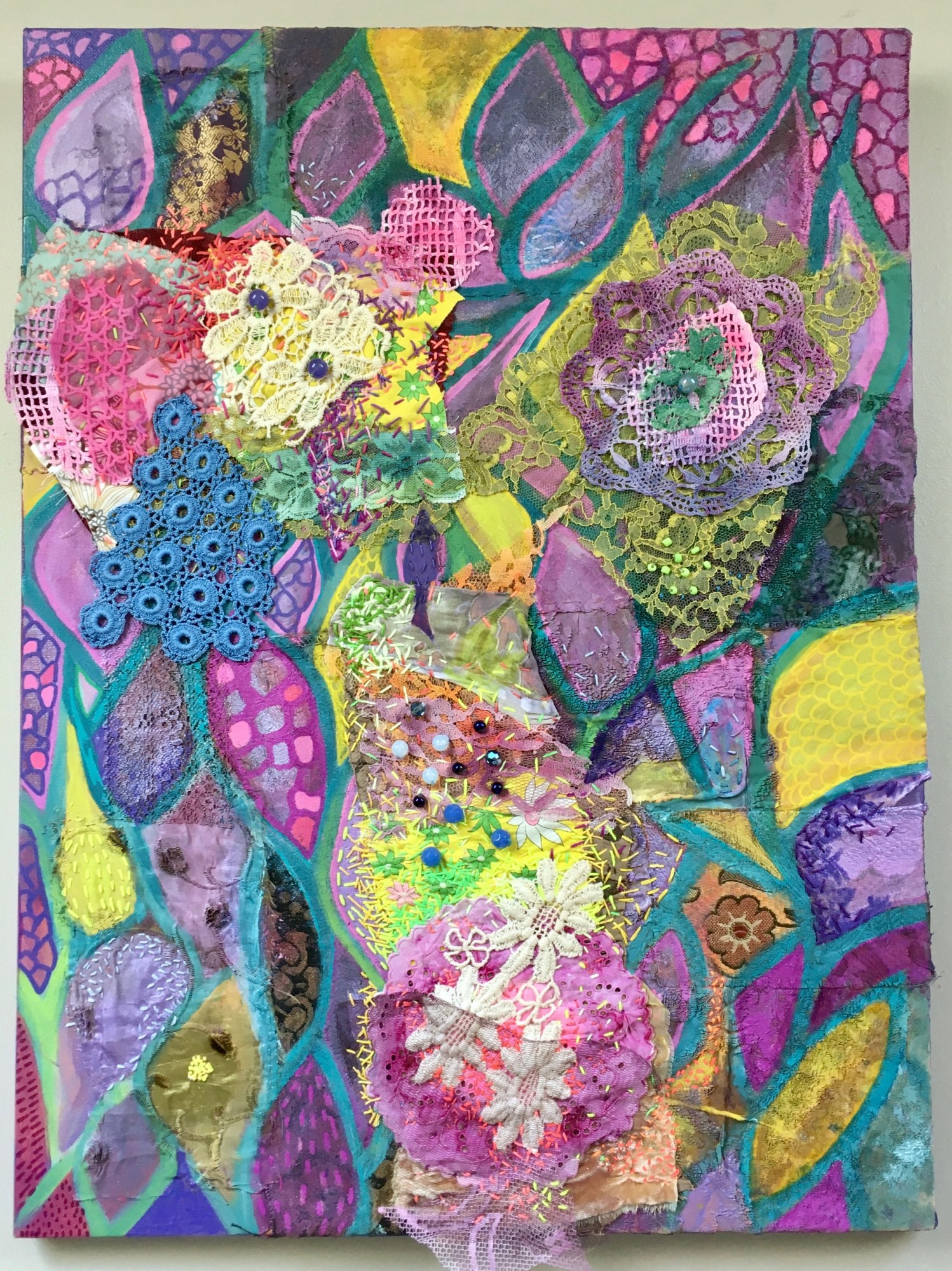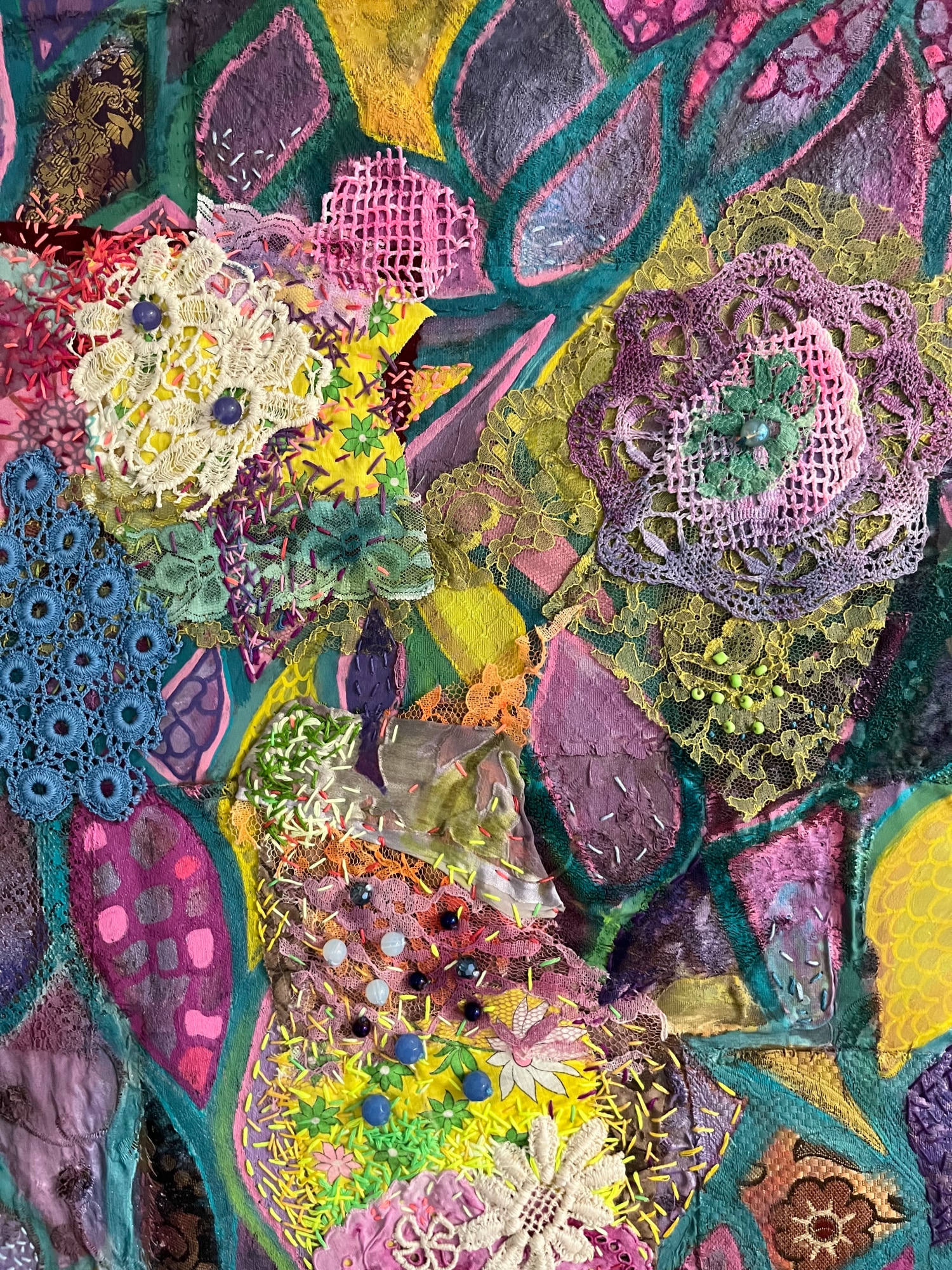 salvaged fabrics, vintage lace, acrylic, embroidery floss, beads