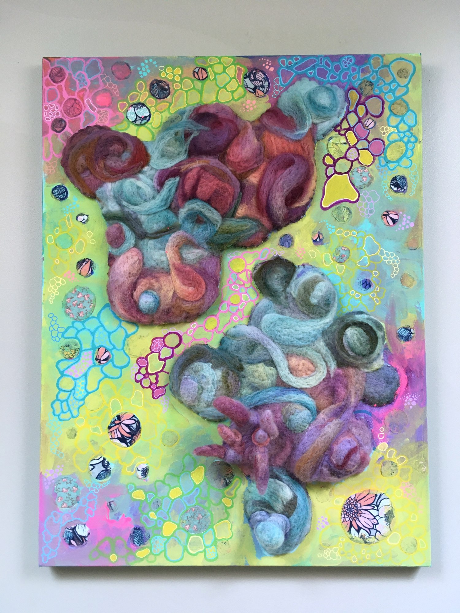 felted wool, mixed fibers, acrylic, fabrics