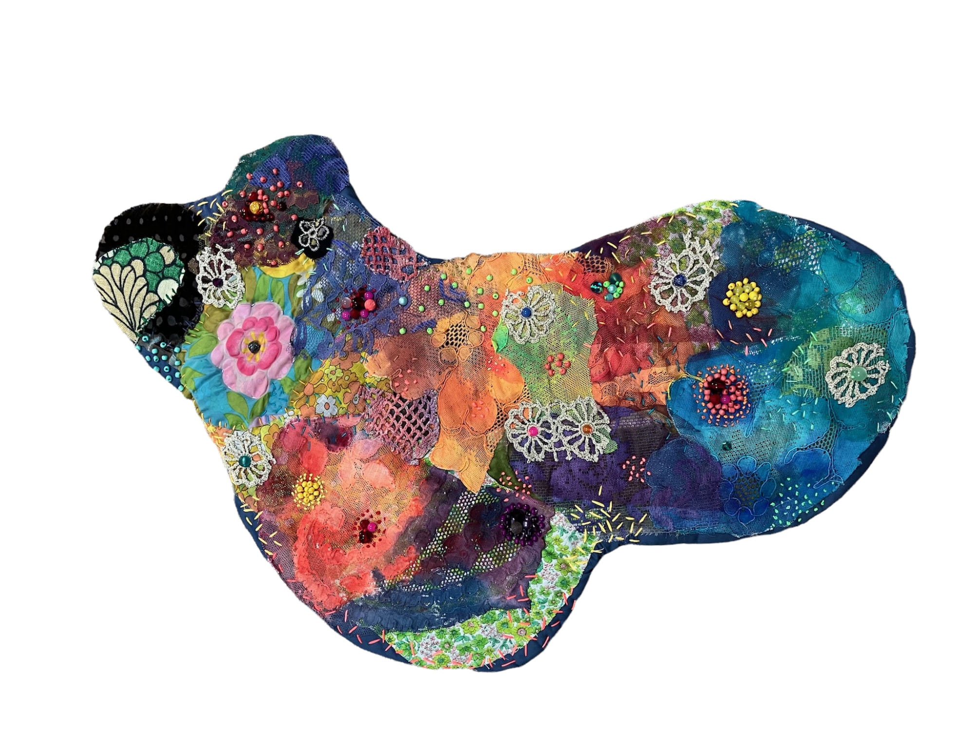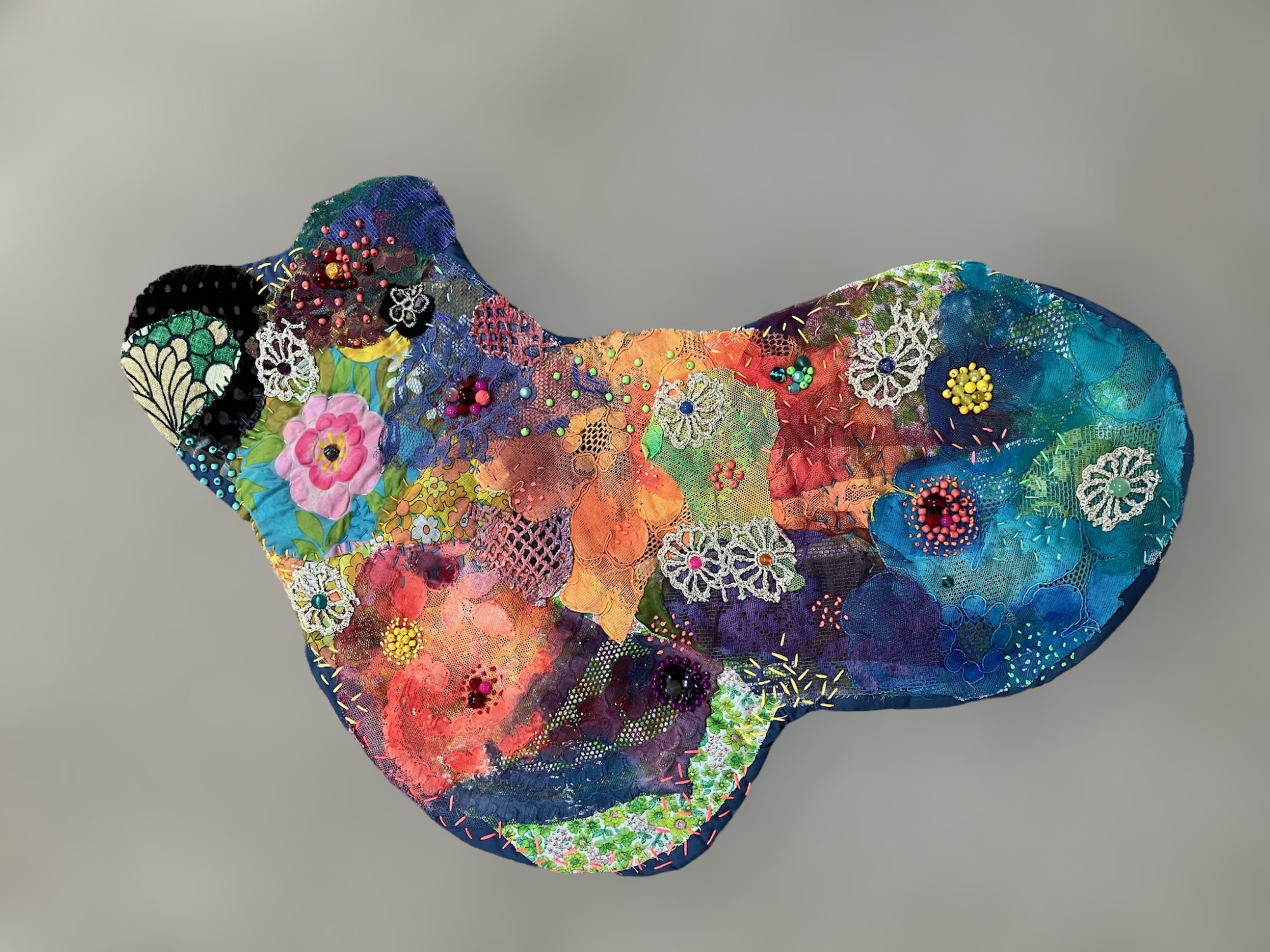 Heirloom textiles, vintage and salvaged fabrics, painted vintage lace, glass beads with mixed recycled fiber batting