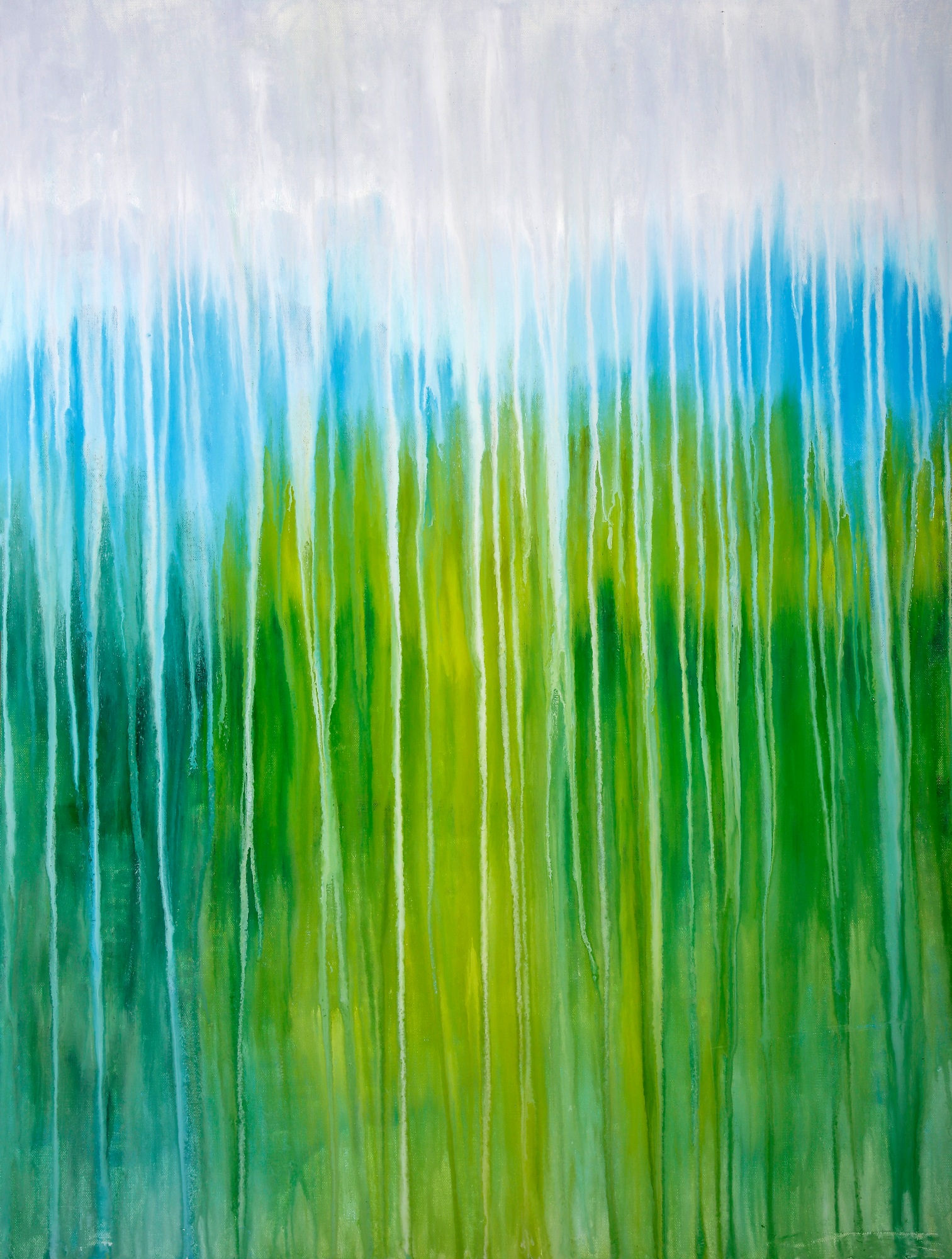 This greenscape oil painting is inspired by the rainy reflections off a pond in the Blue Ridge Mountains of North Carolina. I was stunned by the range of summer green hues in the grass, bushes, flowers and trees, all with the blue of the mountains rising in the backround sky. I imagined this scene as though viewing it through a window as it's pouring rain out, abstracted the colors and dragging some of the color from the top of the window canvas as the raindrops roll down the scene. At a certain point, this is artwork is no longer about the scene that it started as, because then it is transformed, abstracted, and recreated in the celebration of materiality, texture, and temporality in the process.