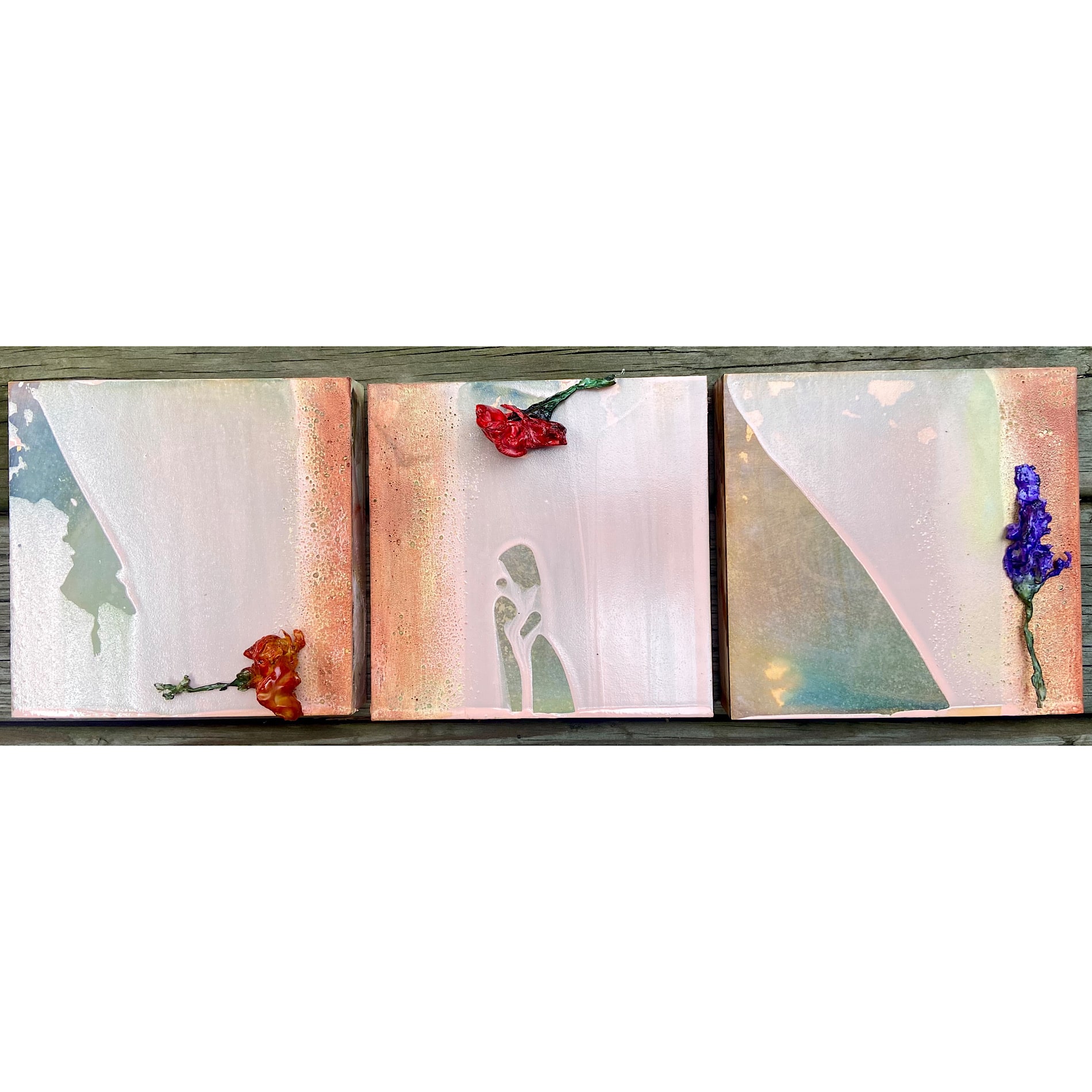 Painting: alcohol ink, oil paint, acrylic. Fire sculpted flower: yupo, alcohol ink, fire.
