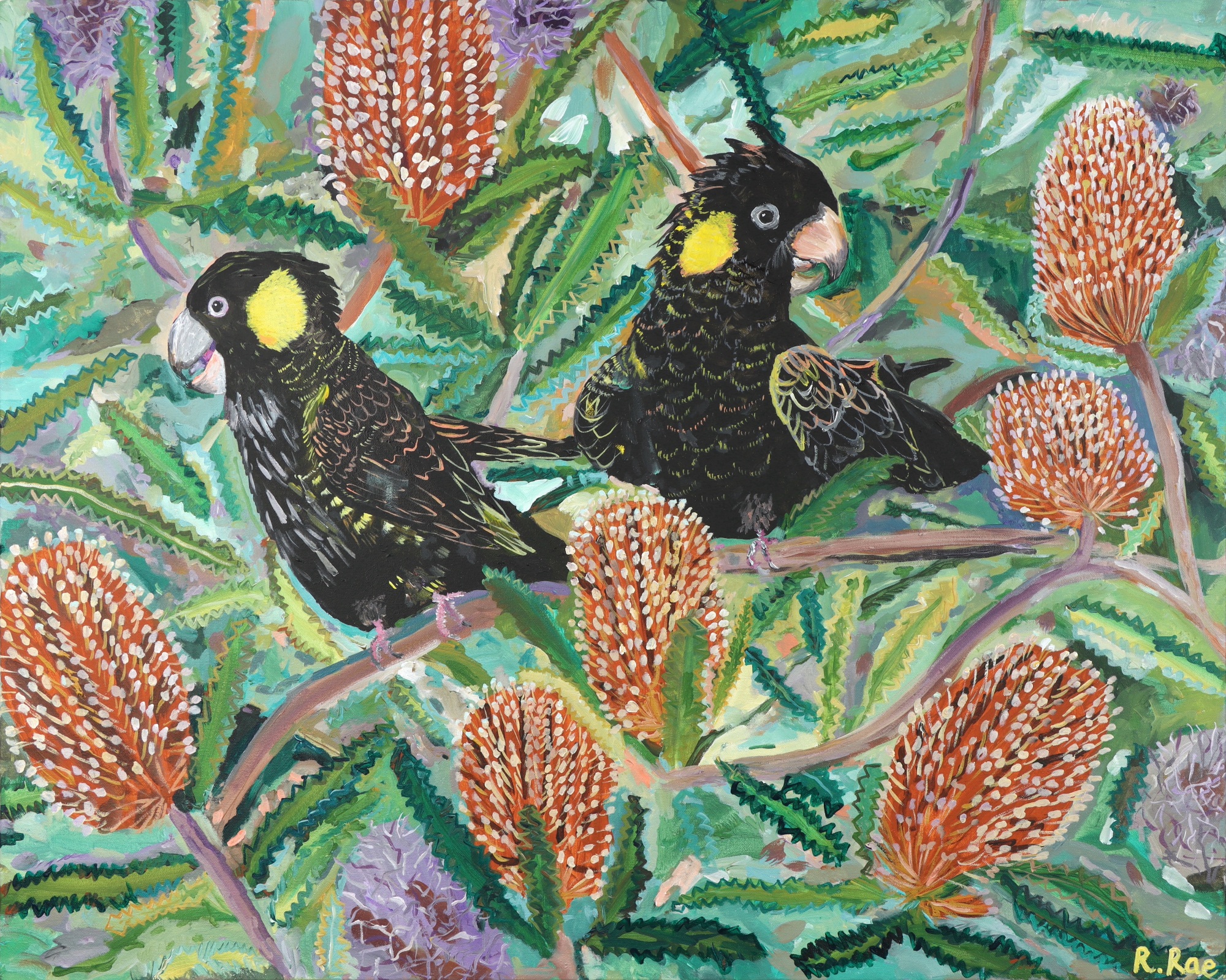 Black Cockatoos in the Banksias by Rachel Rae - Squark! Squark! I hear the Black Cockatoos as I walk past the Banksia Trees. They seem very excited to feast on the banksia flowers. I see flashes of black and yellow feathers as they hang from the branches. Some orange banksias are in full bloom whilst some look like little grey haired banksia men like in Snuggle Pot and Cuddle Pie. Once they have had their feed the black cockatoos fly off in search of their next landing place. This original painting by Rachel Rae is painted in acrylic with a varnish on a deep stretched canvas and is ready to hang.