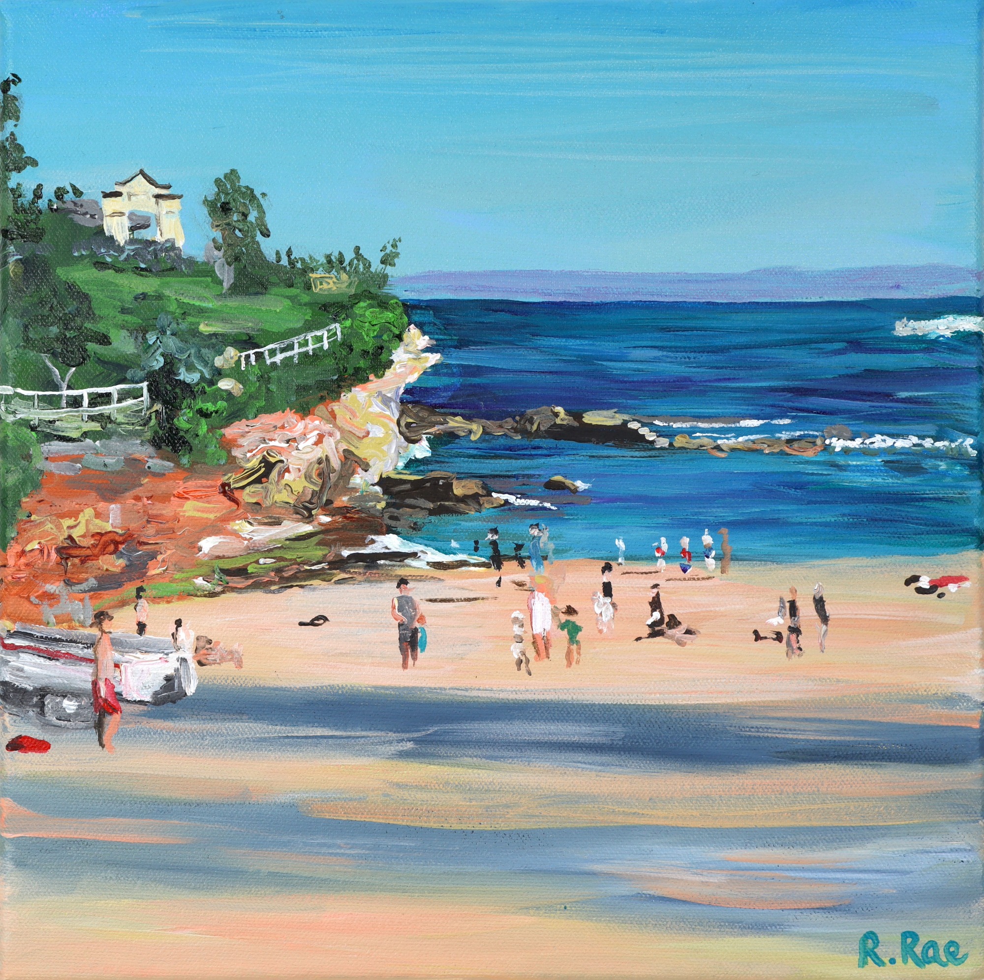 I was waiting for some friends before my work christmas party in Coogee and I was watching the beach. The sun was going down and the shadows were getting longer and longer on the beach. The air was still warm and the people were enjoying the last moments of sunlight. Whilst part of me wanted to join them and dive into the ocean, another part of me was excited for a night out after the isolation of lockdown. This original painting by Rachel Rae is painted in acrylic with a varnish on a deep stretched canvas and is ready to hang.