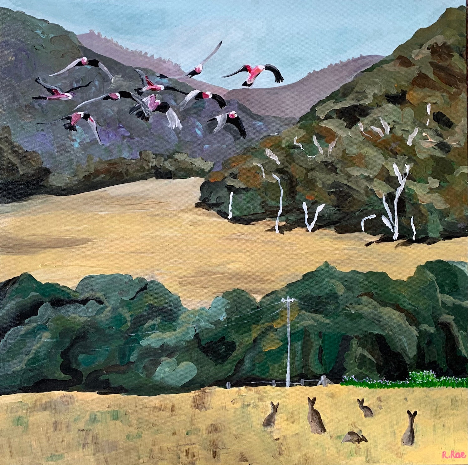 Mt Beauty - Kiewa Valley original painting by Australian Artist Rachel Rae. Whilst visiting friends at Mt Beauty at Christmas I pondered the border closures. I watched the kangaroos jump the fences and the pink and grey galahs flying wherever they wanted. Freedom! Who knows whats around the next bend in the future. The golden fields, the grey trees peaking through up the hillside, the purple hills folding into the distance. Painted in acrylic with a protective varnish on a deep stretched canvas this original painting is ready to hang.