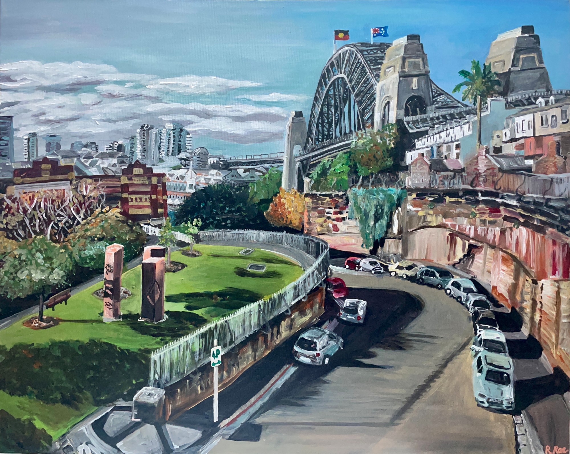 On a walk around The Rocks in Sydney with a friend we cut through the terrace houses to Pottinger Street. As we appeared from between the terraces looking down the curve of Pottinger Street and rising before us was the Sydney Harbour Bridge. There was the NSW Flag and the Australian Flags flying. Where was the flag of our First Nations People? Did you know the symbol of the oldest culture in Australia only flys on the Harbour Bridge for 19 out of the 365 days of the year? Whilst there is a campaign to raise funds to erect another flag pole for the Indigenous flag, at least for now in this painting it will fly every day in recognition.