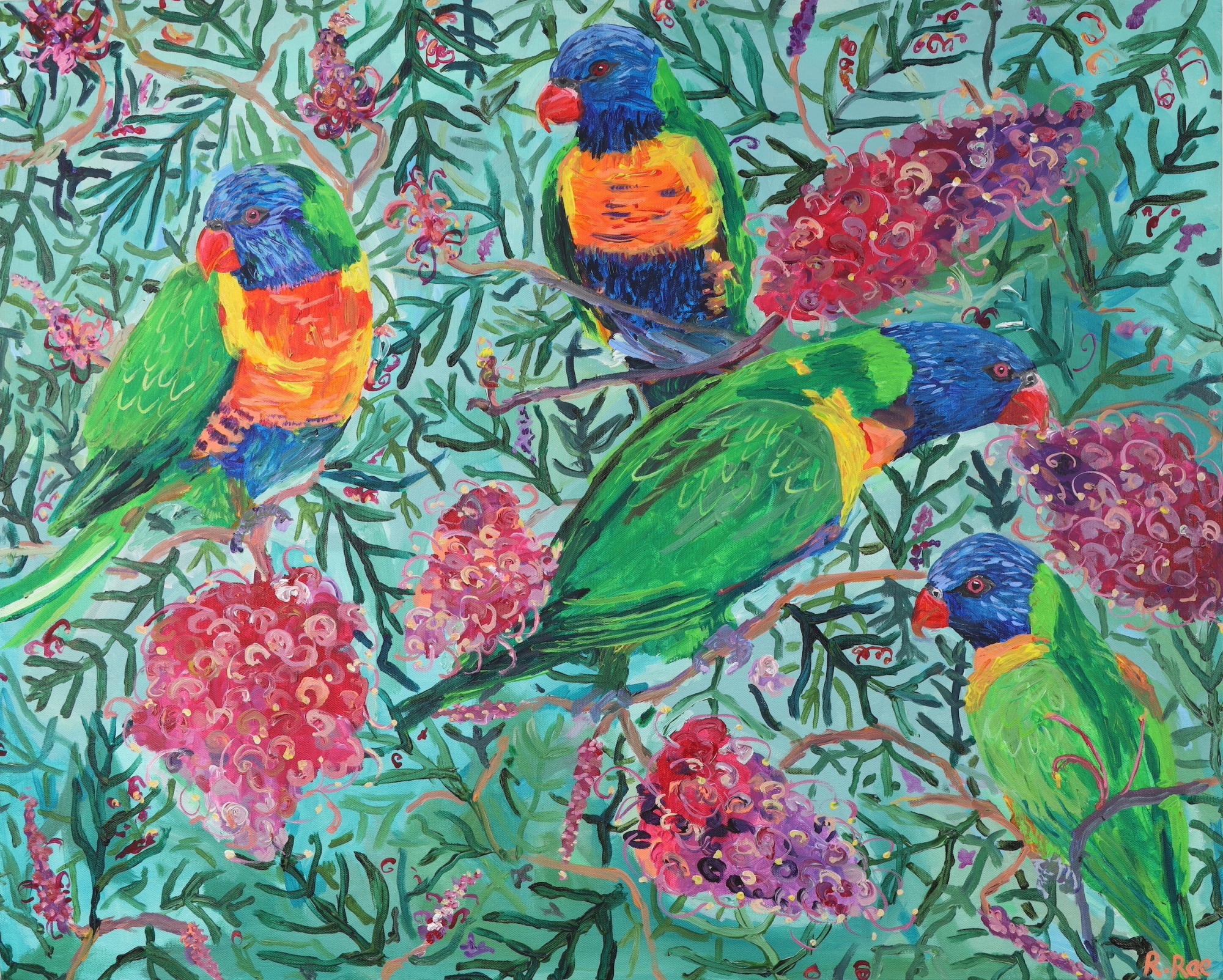 Rainbow Lorikeets in the Grevillea by Rachel Rae - A flash of colours fly past me as a flock of rainbow lorikeets come to land on the grevillea tree. The blues, greens, orange and reds of the birds highlight the pinks and yellows of the flowers. The lorikeets drink the nectar of the flowers as the spindly flowers curl around creating spirals. The birds also spin around the flowers as they try to get the best angle. This original painting by Rachel Rae Art is painted in acrylic with a varnish on a deep stretched canvas and is ready to hang.