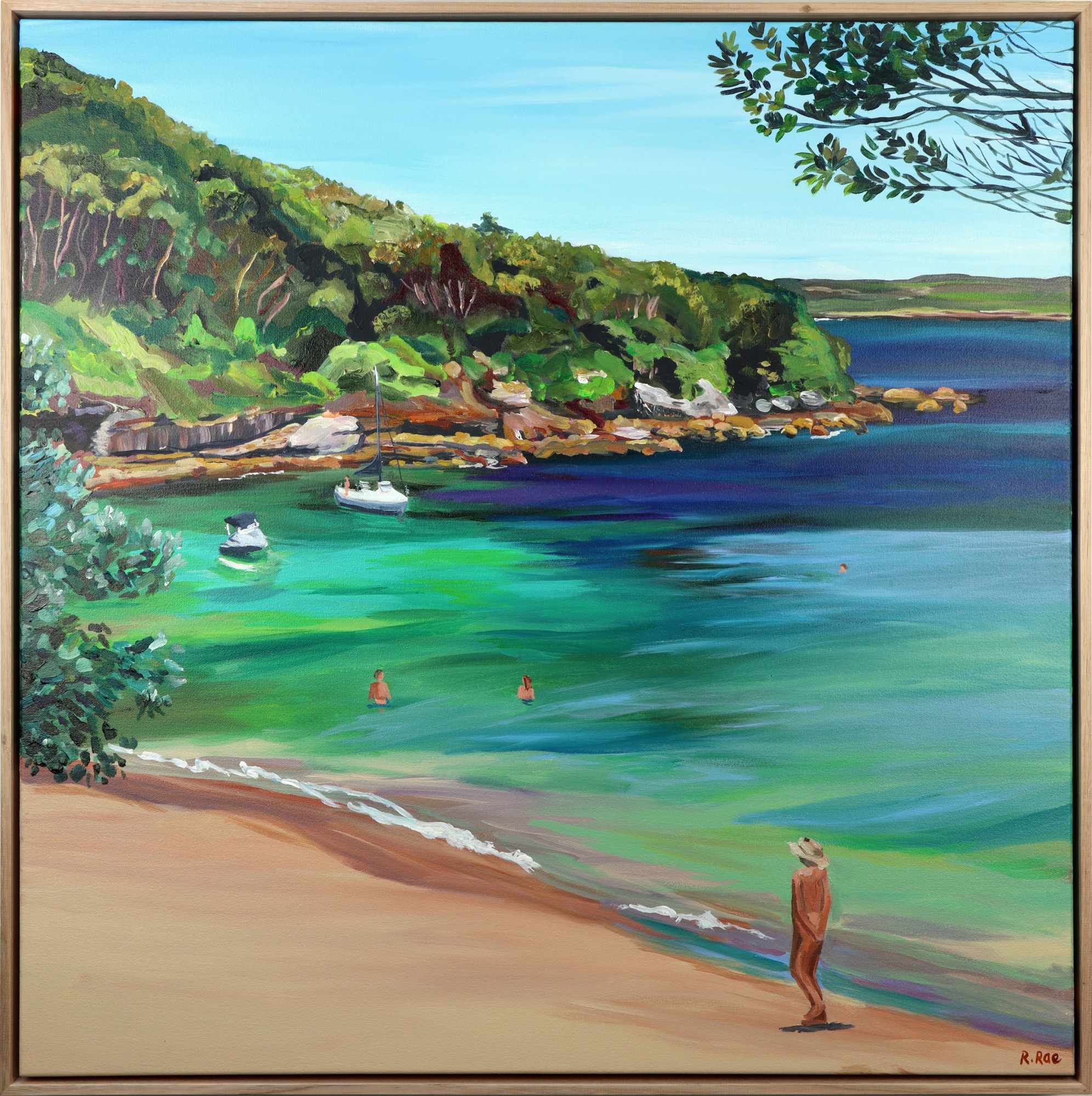 Revealing Wanderings is an original painting by Australian Artist Rachel Rae - As I walk along the path over the hill the natural splendor of the coast reveals itself with tranquil allure. The National Park creates a majestic backdrop, its verdant hues contrasting against the vast expanse of the cerulean sky. Nestled in the bay below, a couple of boats sway gently in the shimmering turquoise waters. Amidst this idyllic scene, a lone figure, adorned only with a hat, strolls leisurely along the water's edge, the golden sand warm beneath his bare feet. Nearby, a few others revel in the freedom of the nudist beach, swimming in the crystalline waters. It's a scene of unbridled freedom and natural beauty, where the harmony of land, sea, and sky beckons the viewer into a world of serene contemplation. This original painting by Rachel Rae is painted in acrylic with a protective varnish on a deep stretched canvas, framed in Tasmanian Oak it is ready to hang.